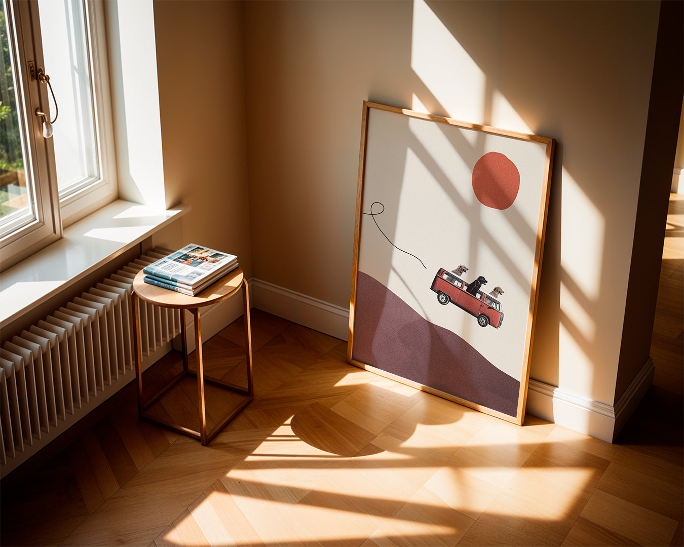 Wir arbeiten mit Massivholz- und Aluminiumrahmen. Alle gerahmten Produkte werden bereits montiert und fertig zum Aufhängen geliefert. Die Frontabdeckung besteht aus transparentem Acrylglas.