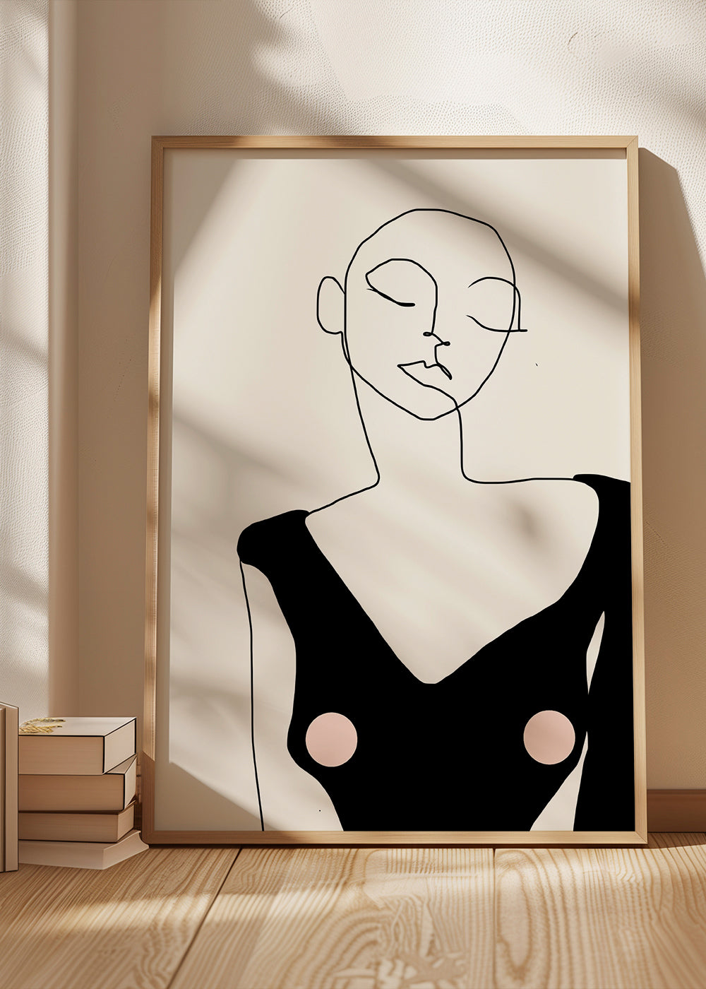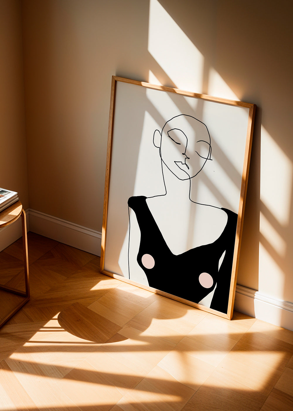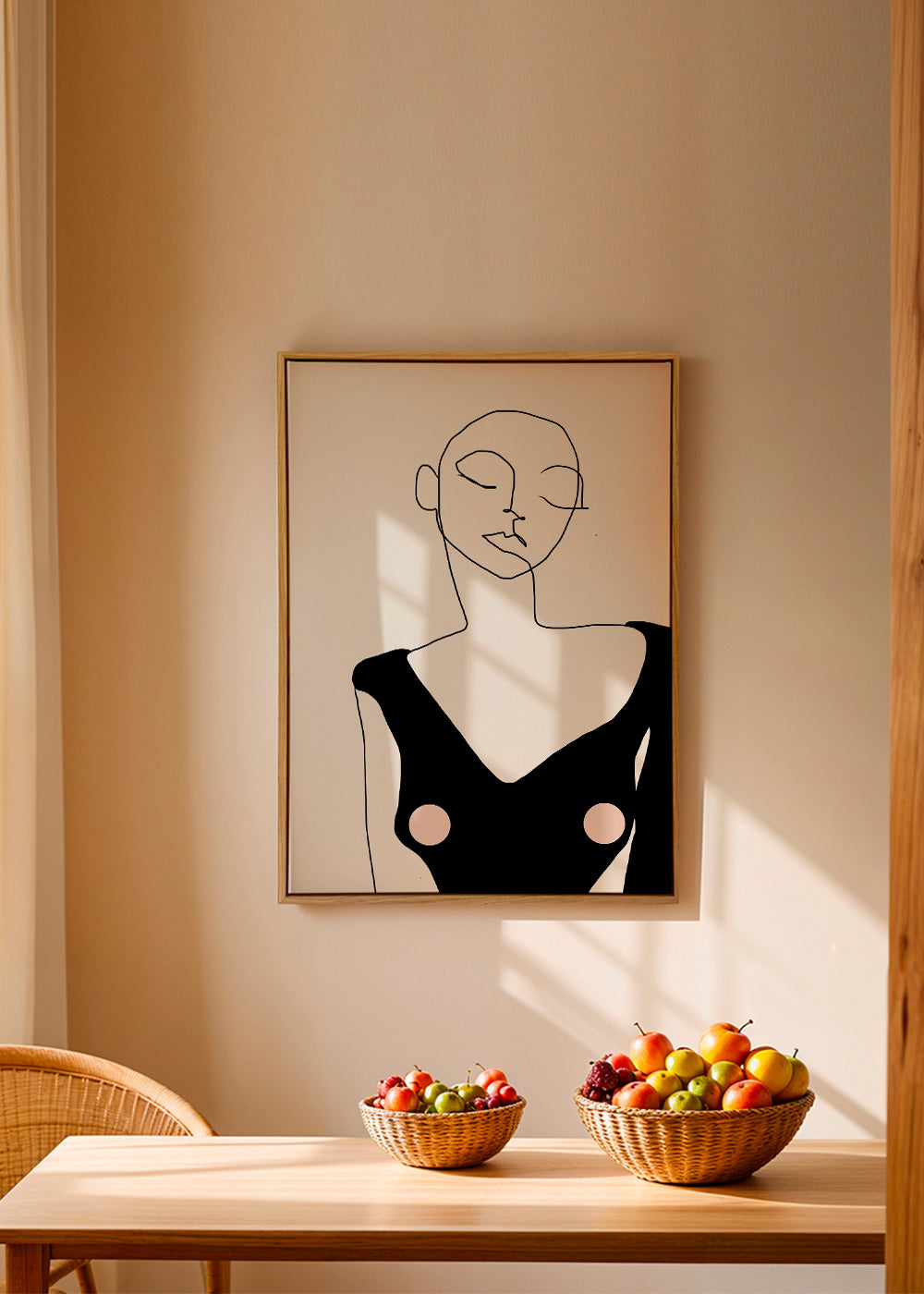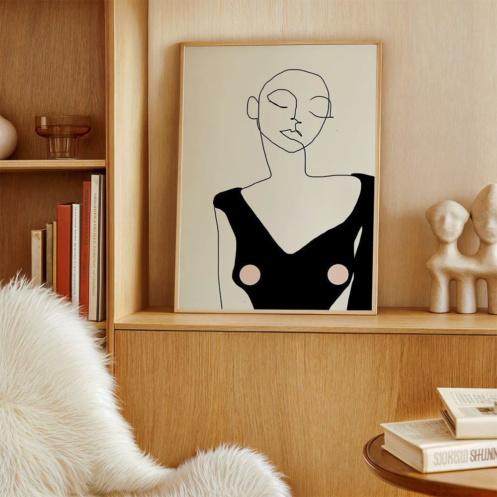 Schönes Wandbild aus unserer Kollektion von wandbild mit frau, kreiert von Sophia Novosel, mit Farbtönen Schwarz, und Bildorientierung Vertikal. Wandbilder mit Zeichnungen und Skizzen verleihen jeder Inneneinrichtung einen originellen Touch. Die beste Lösung für leere, langweilige Wände.