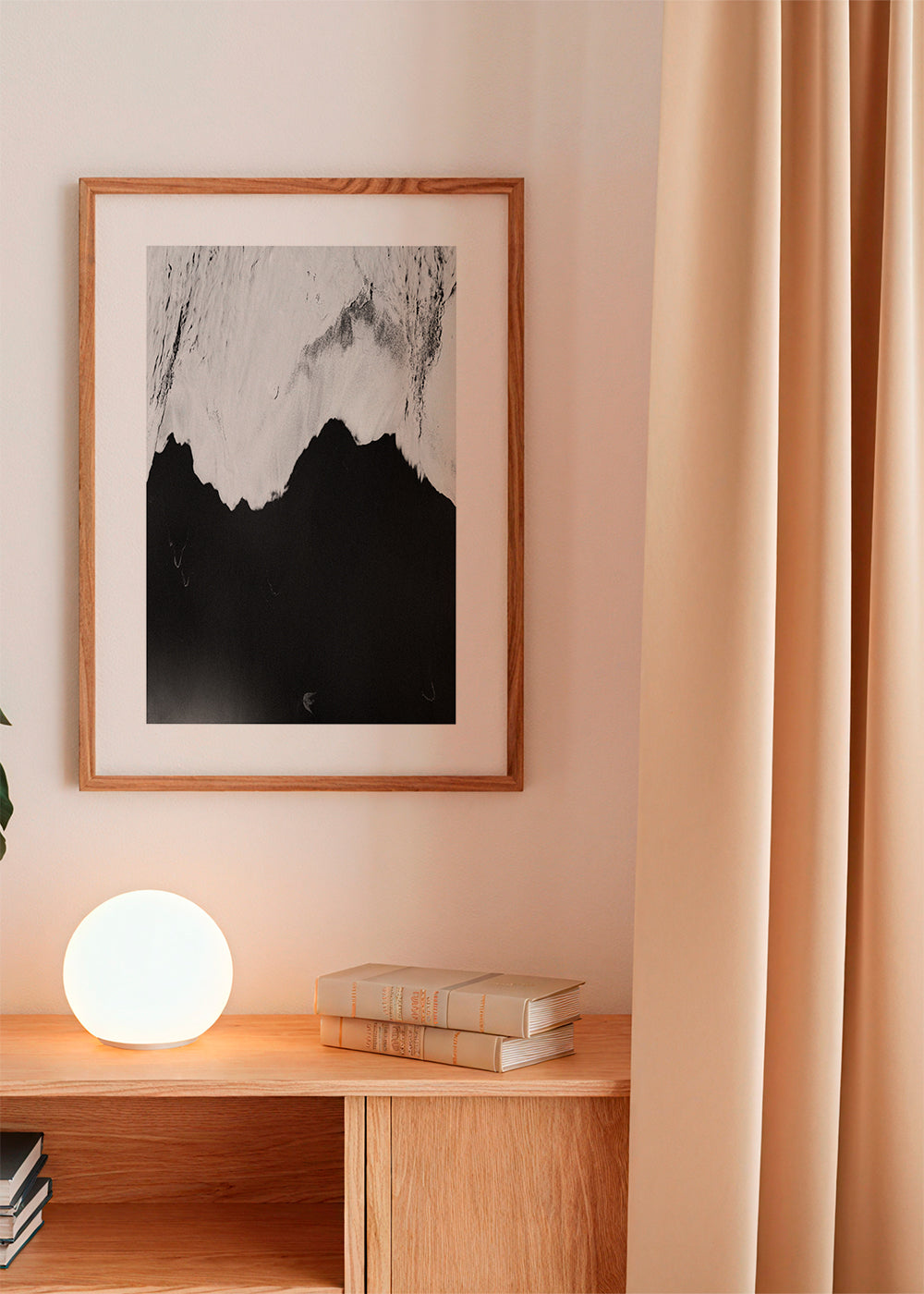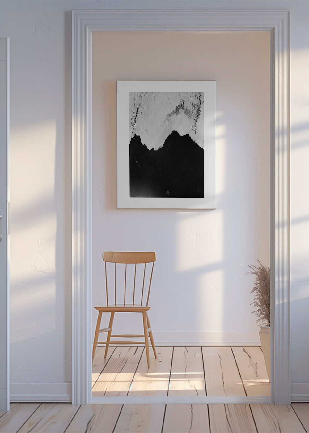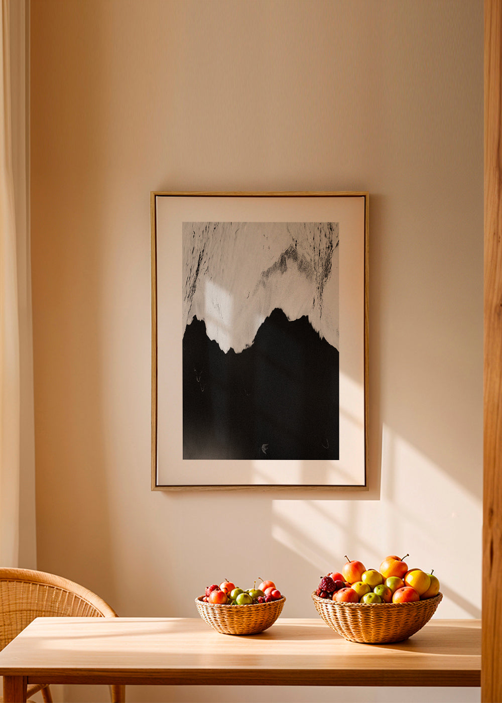 Wir arbeiten mit Massivholz- und Aluminiumrahmen. Alle gerahmten Produkte werden bereits montiert und fertig zum Aufhängen geliefert. Die Frontabdeckung besteht aus transparentem Acrylglas.