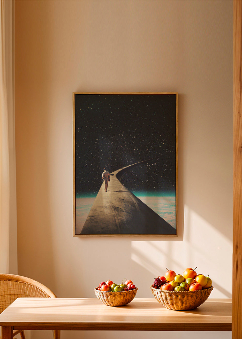 Wenn Sie die Passepartout-Option wählen, fügen wir die weiße matte Platte dem Rahmen hinzu und reduzieren das Design der Arbeit. Wählen Sie beispielsweise ein Druckformat 50x70 cm, mit eichenfarbenem Rahmen und Passepartout, reduzieren wir das Design des Druckes auf das bisherige Format (40x50cm). So passt es sich perfekt an das Innenfenster des Passepartouts an.