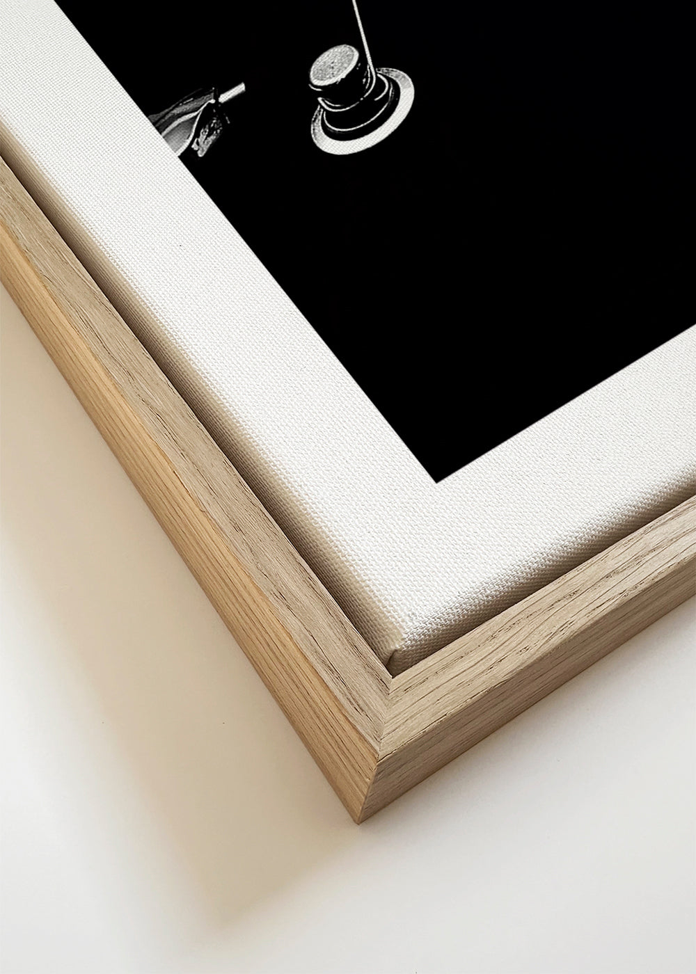 Wenn Sie die Passepartout-Option wählen, fügen wir die weiße matte Platte dem Rahmen hinzu und reduzieren das Design der Arbeit. Wählen Sie beispielsweise ein Druckformat 50x70 cm, mit eichenfarbenem Rahmen und Passepartout, reduzieren wir das Design des Druckes auf das bisherige Format (40x50cm). So passt es sich perfekt an das Innenfenster des Passepartouts an.