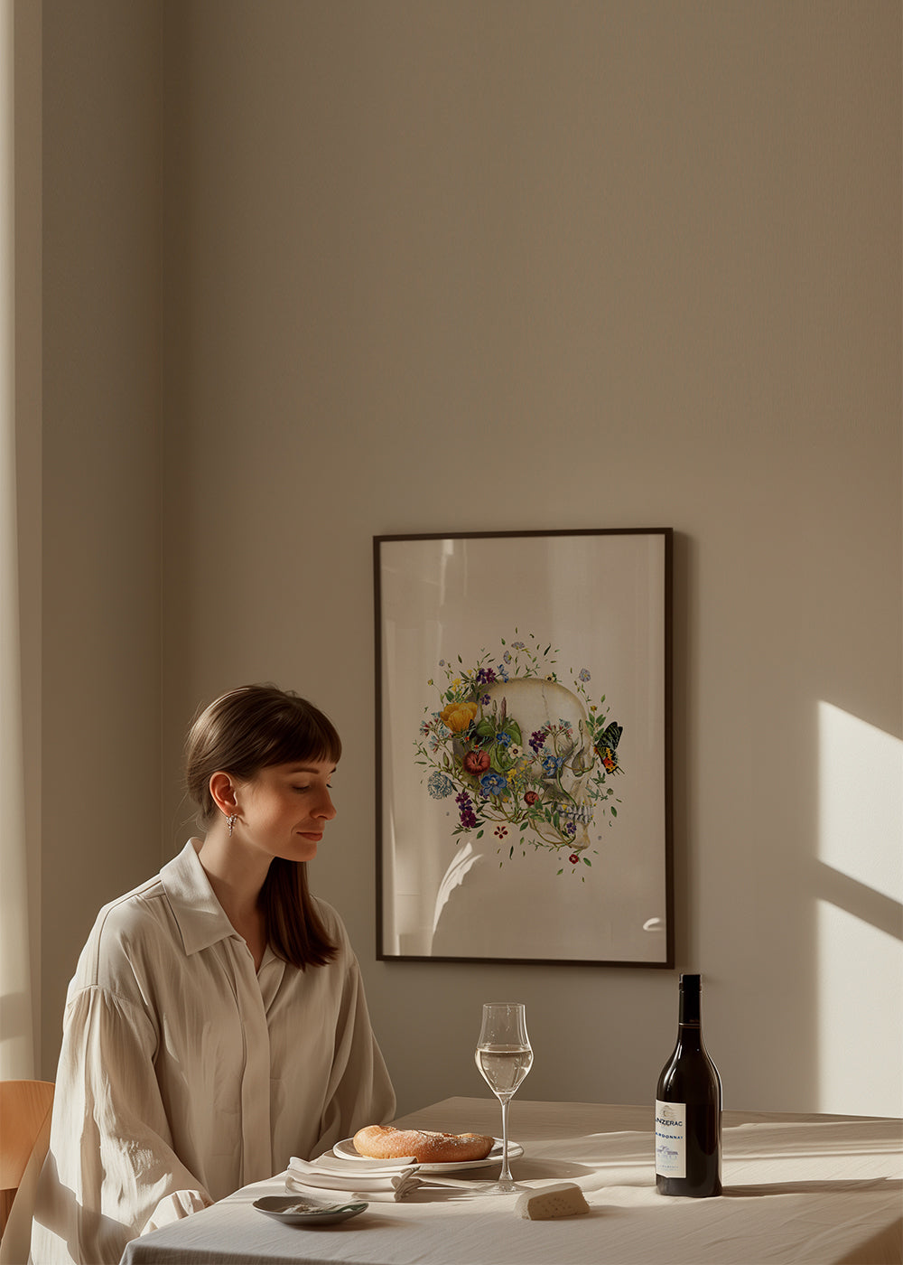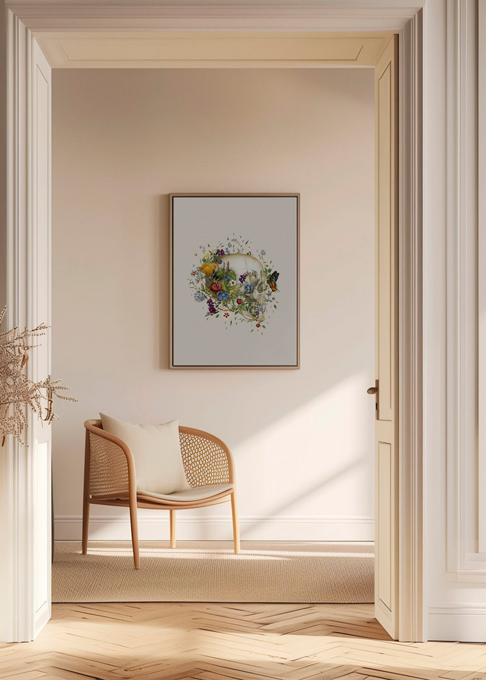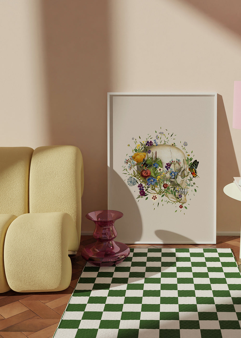 Ein Gemälde im Stil unserer Totenkopfgemälde von Frida Floral Studio, mit mehrfarbigen Farbtönen und im Hochformat. Verleihen Sie der Umgebung einen Vintage-Touch, indem Sie dieses und andere Poster im Retro-Stil kombinieren. Bauen Sie Ihre Lieblingsecke.