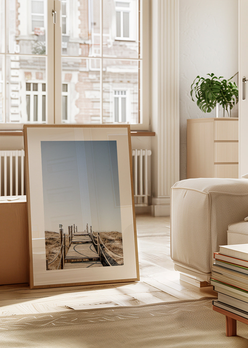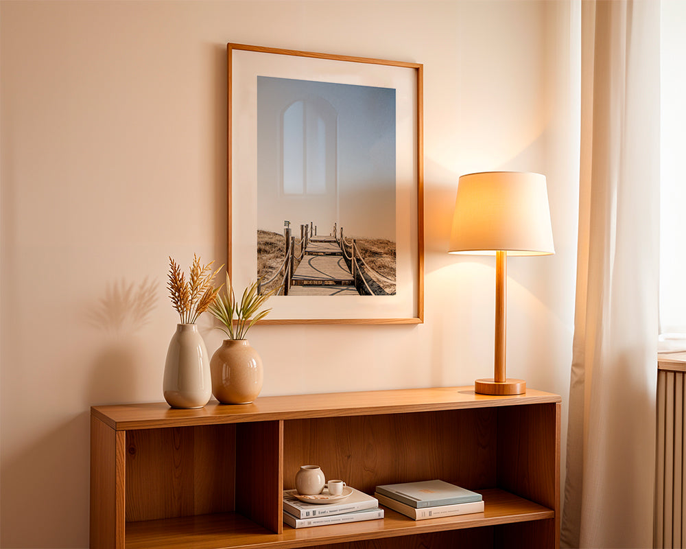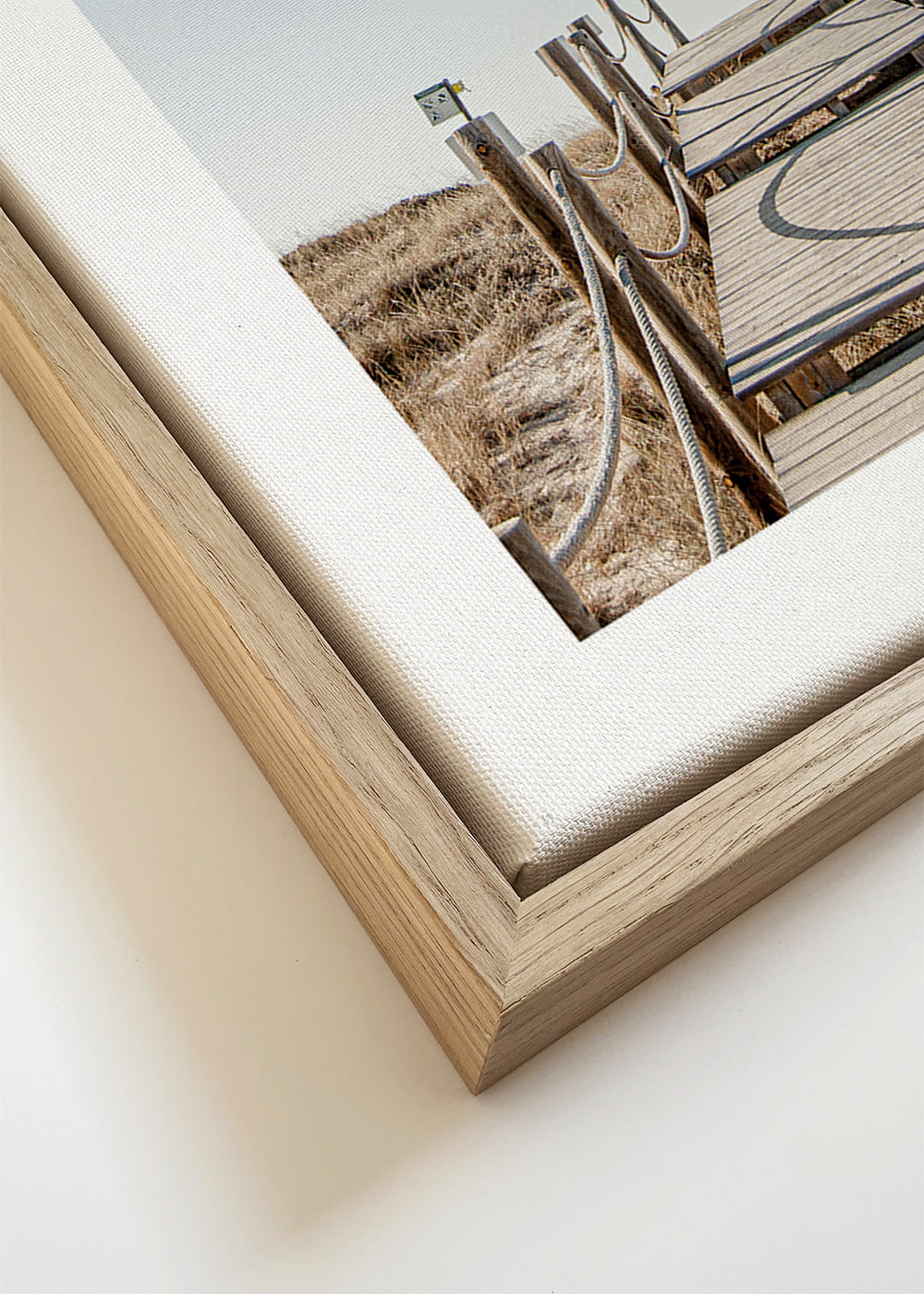 Wenn Sie die Passepartout-Option wählen, fügen wir die weiße matte Platte dem Rahmen hinzu und reduzieren das Design der Arbeit. Wählen Sie beispielsweise ein Druckformat 50x70 cm, mit eichenfarbenem Rahmen und Passepartout, reduzieren wir das Design des Druckes auf das bisherige Format (40x50cm). So passt es sich perfekt an das Innenfenster des Passepartouts an.