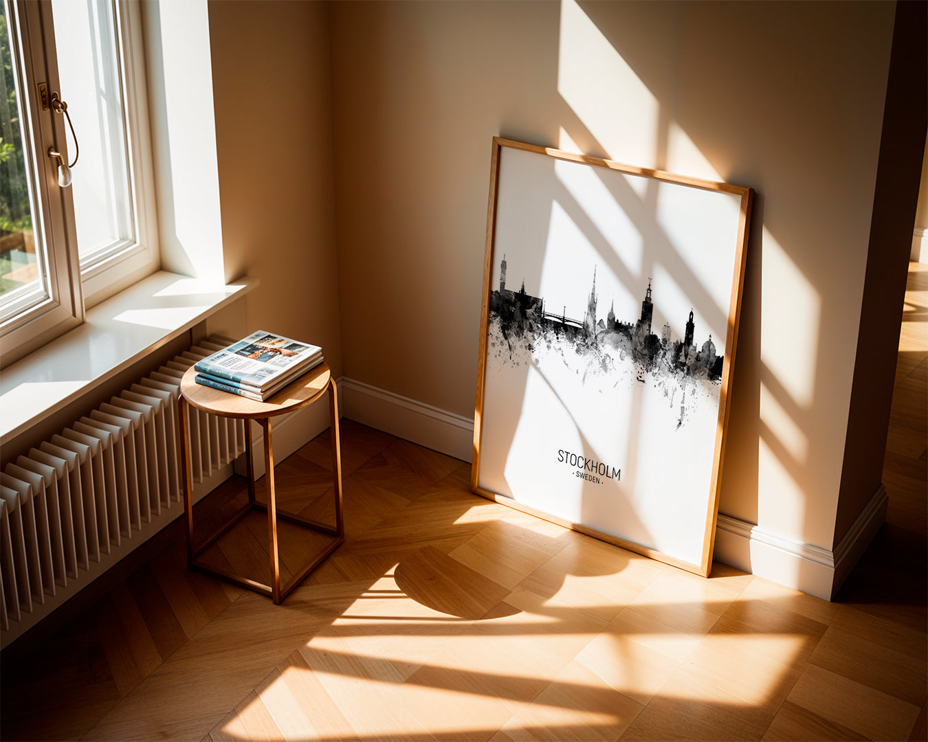 Wir arbeiten mit Massivholz- und Aluminiumrahmen. Alle gerahmten Produkte werden bereits montiert und fertig zum Aufhängen geliefert. Die Frontabdeckung besteht aus transparentem Acrylglas.