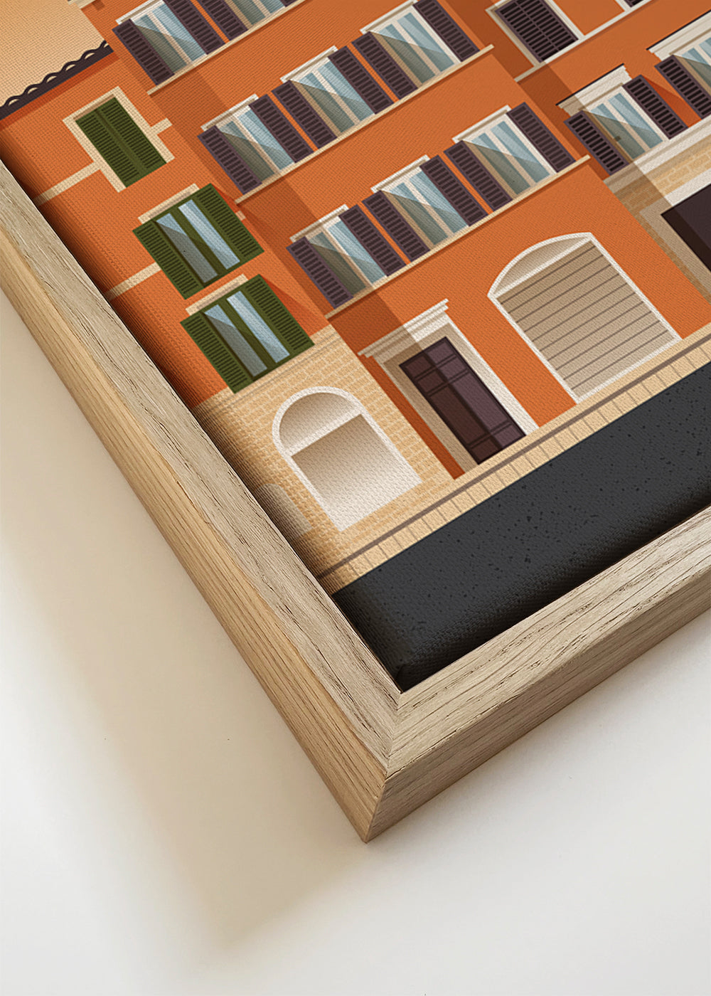 Wenn Sie die Passepartout-Option wählen, fügen wir die weiße matte Platte dem Rahmen hinzu und reduzieren das Design der Arbeit. Wählen Sie beispielsweise ein Druckformat 50x70 cm, mit eichenfarbenem Rahmen und Passepartout, reduzieren wir das Design des Druckes auf das bisherige Format (40x50cm). So passt es sich perfekt an das Innenfenster des Passepartouts an.