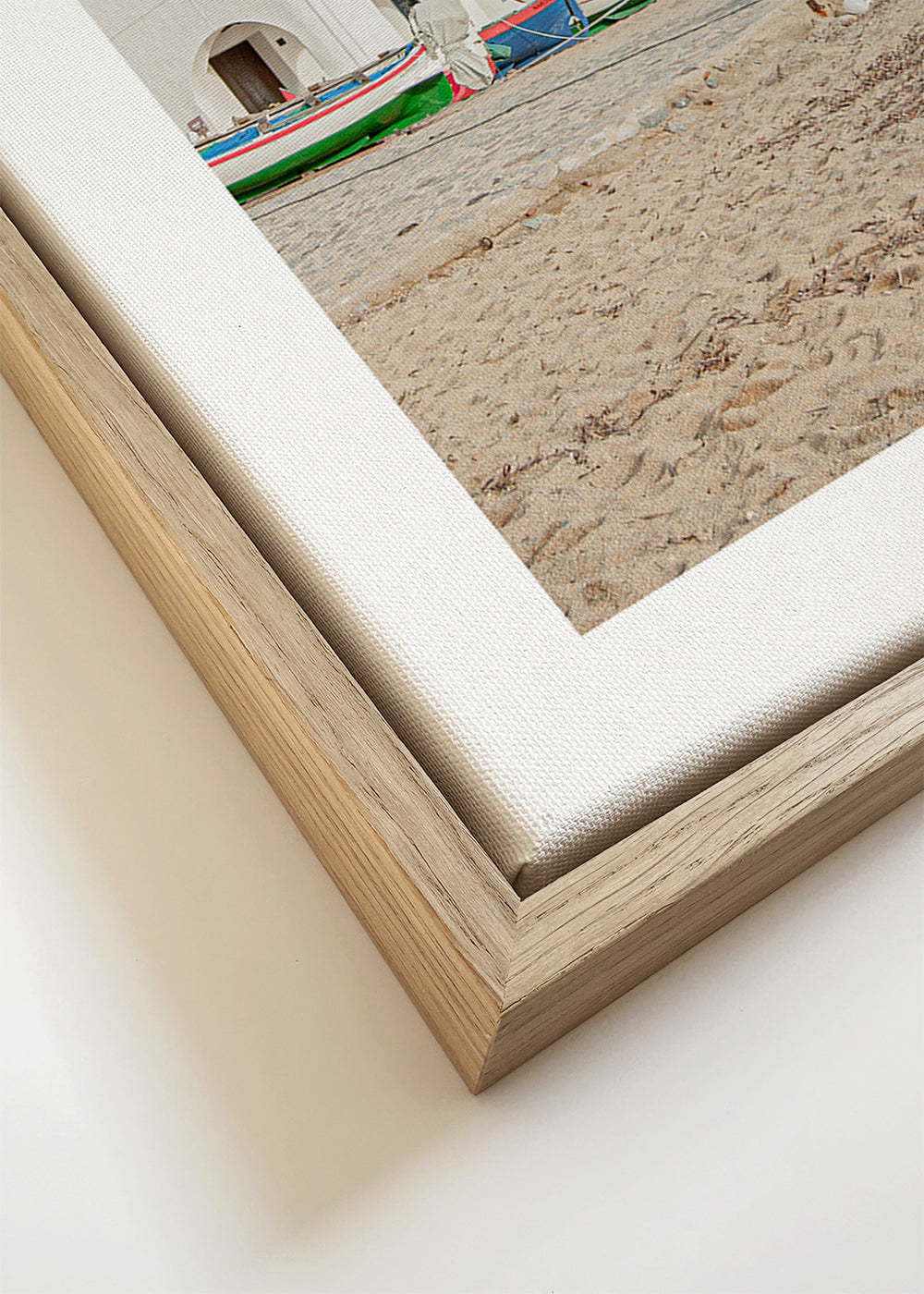 Wenn Sie die Passepartout-Option wählen, fügen wir die weiße matte Platte dem Rahmen hinzu und reduzieren das Design der Arbeit. Wählen Sie beispielsweise ein Druckformat 50x70 cm, mit eichenfarbenem Rahmen und Passepartout, reduzieren wir das Design des Druckes auf das bisherige Format (40x50cm). So passt es sich perfekt an das Innenfenster des Passepartouts an.