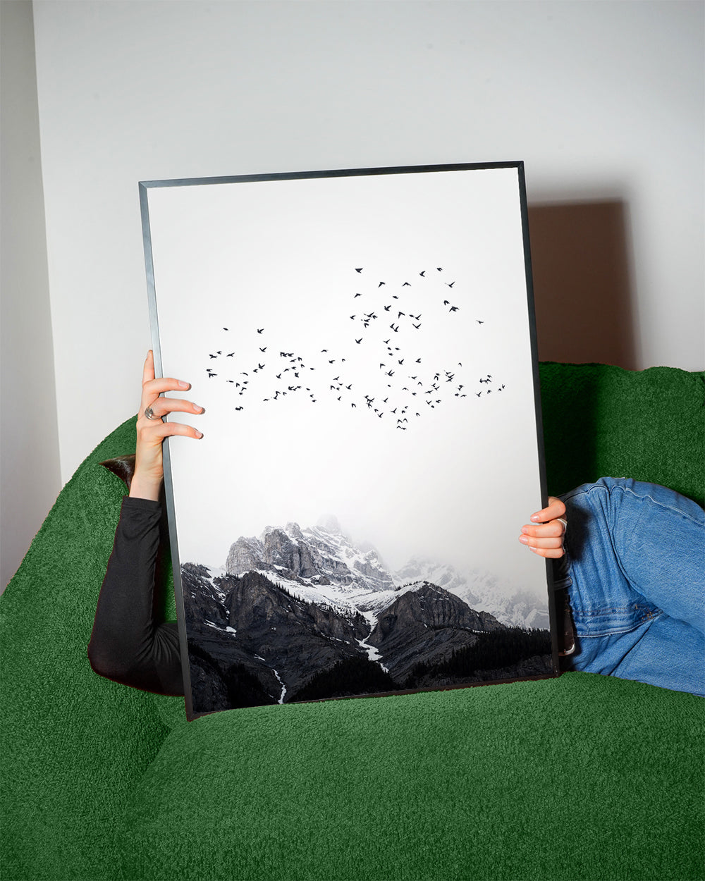 Wenn Sie einen unserer Drucke mit einem der von uns angebotenen Rahmen kombinieren, erhalten Sie die Drucke gerahmt und fertig zum Aufhängen. Falls Sie den Druck und den Rahmen separat kaufen oder Ihre eigenen Drucke hinzufügen möchten, öffnen Sie die hinteren Enden, entfernen Sie die Abdeckung und legen Sie Ihr Blatt bei. Ganz einfach!