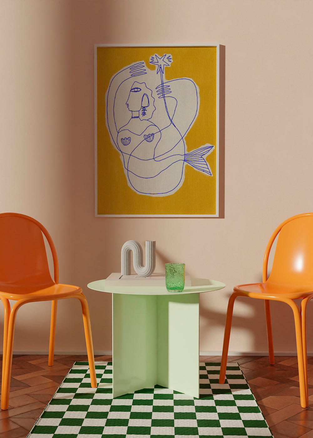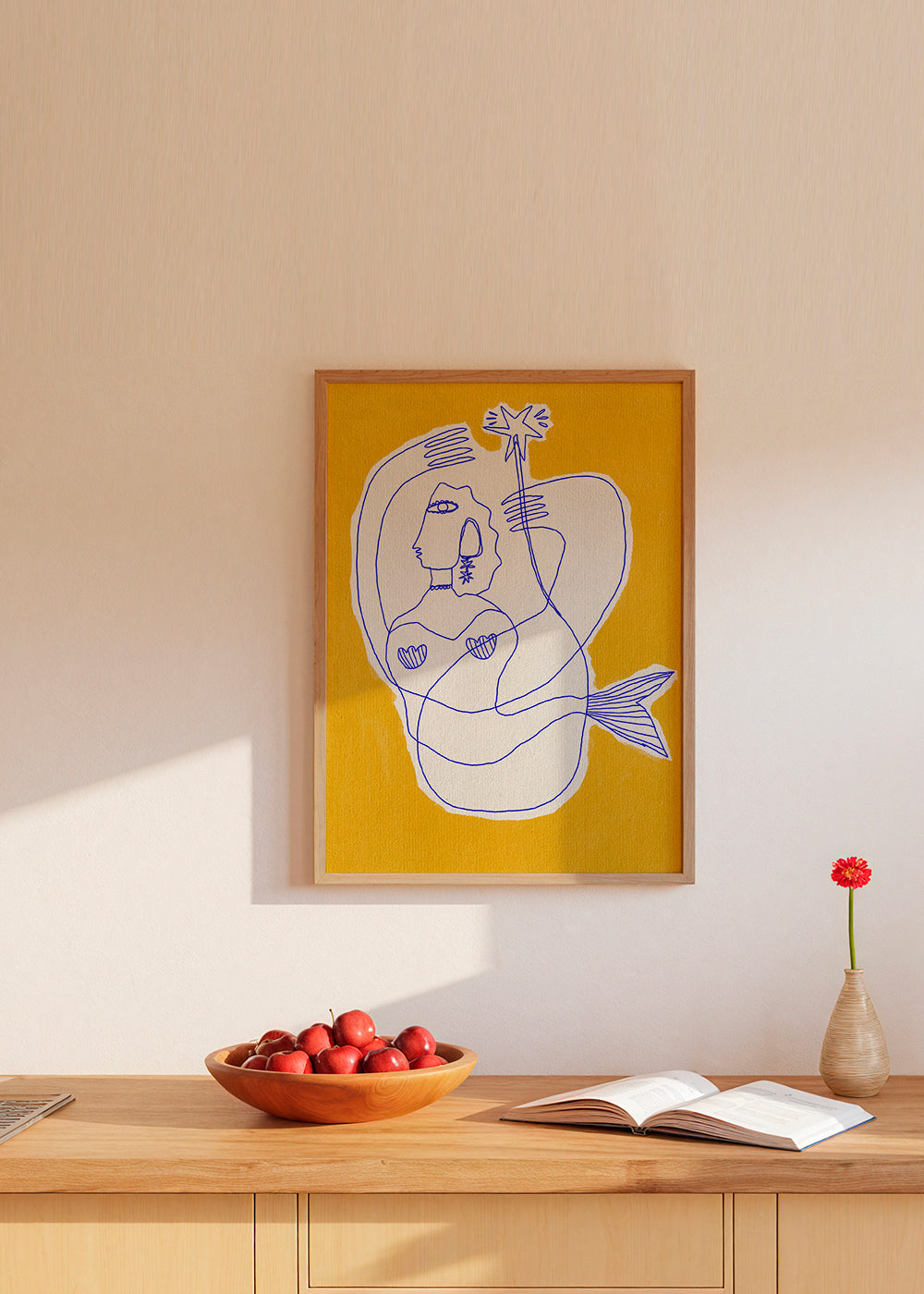 Charaktere mit Geschichte. Schöner druck Ein Meisterwerk von Shatha Dafai. Elegante gelbe palette perfekte vertikal komposition. zeichnungen und skizzen als poster sind perfekt, um deine wände auf kreative weise zu dekorieren. Belebe deinen raum mühelos
