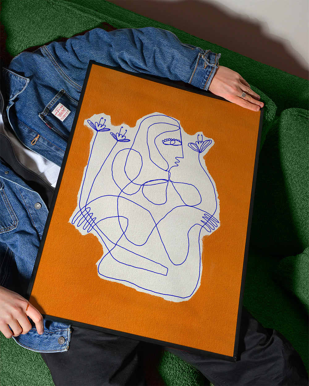 Strich mit Seele. Schöner druck Vision des Künstlers Shatha Dafai. Elegante orangetöne palette präsentiert in einem vertikal stil. Es ist eine schlichte zeichnung mit sauberer linienführung – kombiniere sie mit anderen strich- und linienzeichnungen für eine künstlerische bilderwand. Lass deine wände herausstechen