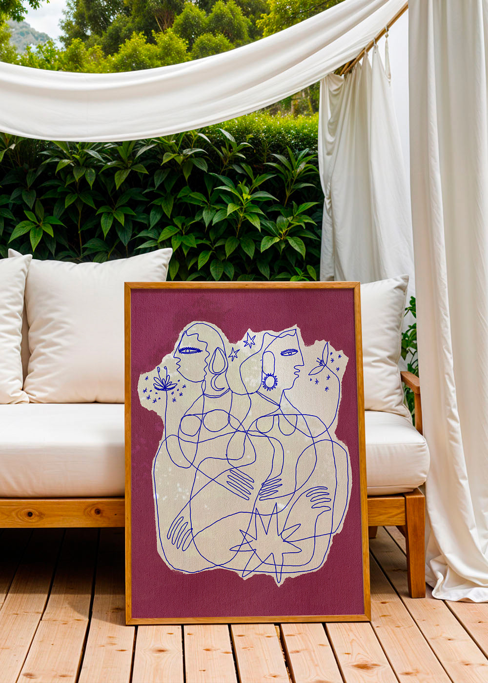 Charaktere mit Geschichte. Schöner druck Vision des Künstlers Shatha Dafai. Reich an violette akzenten mit einem vertikal layout. wandbilder mit zeichnungen und skizzen verleihen jeder inneneinrichtung einen originellen touch. Verwandle deine langweiligen wände