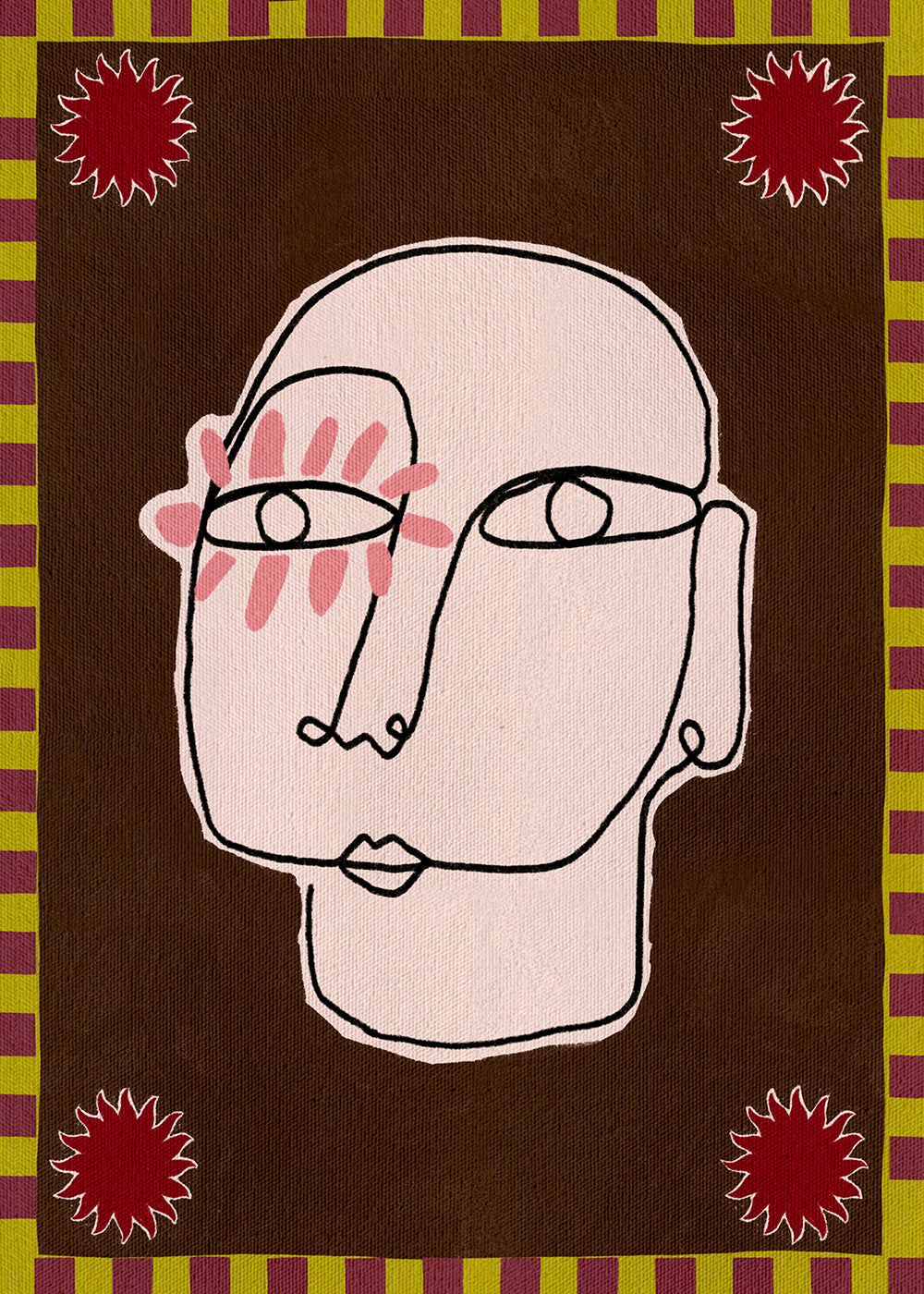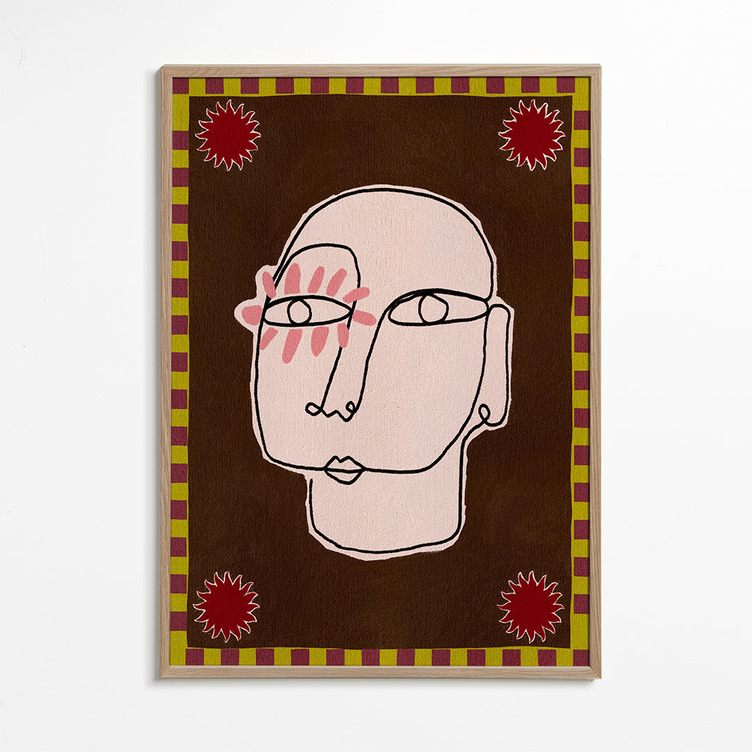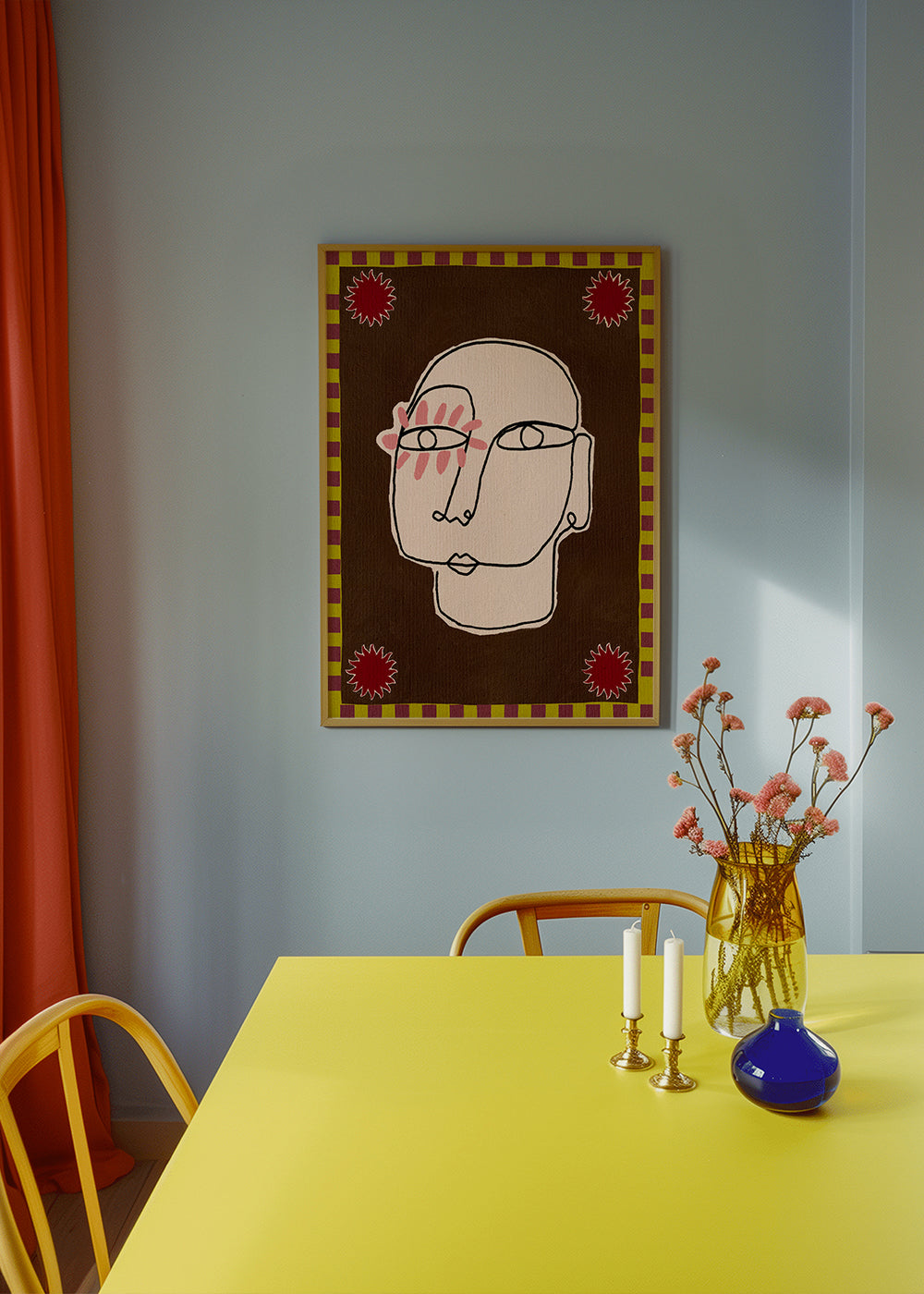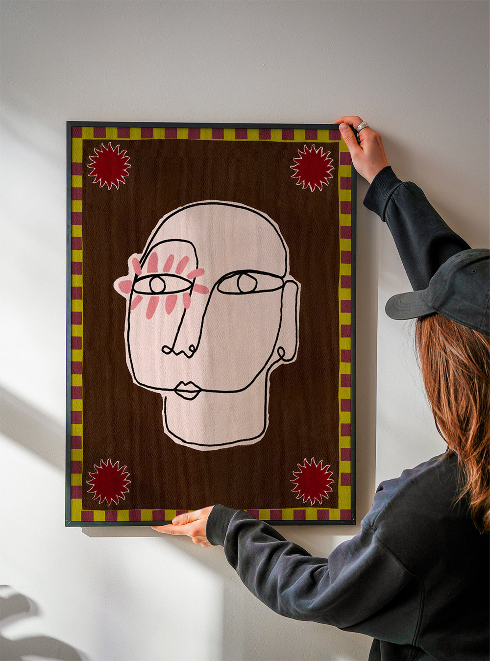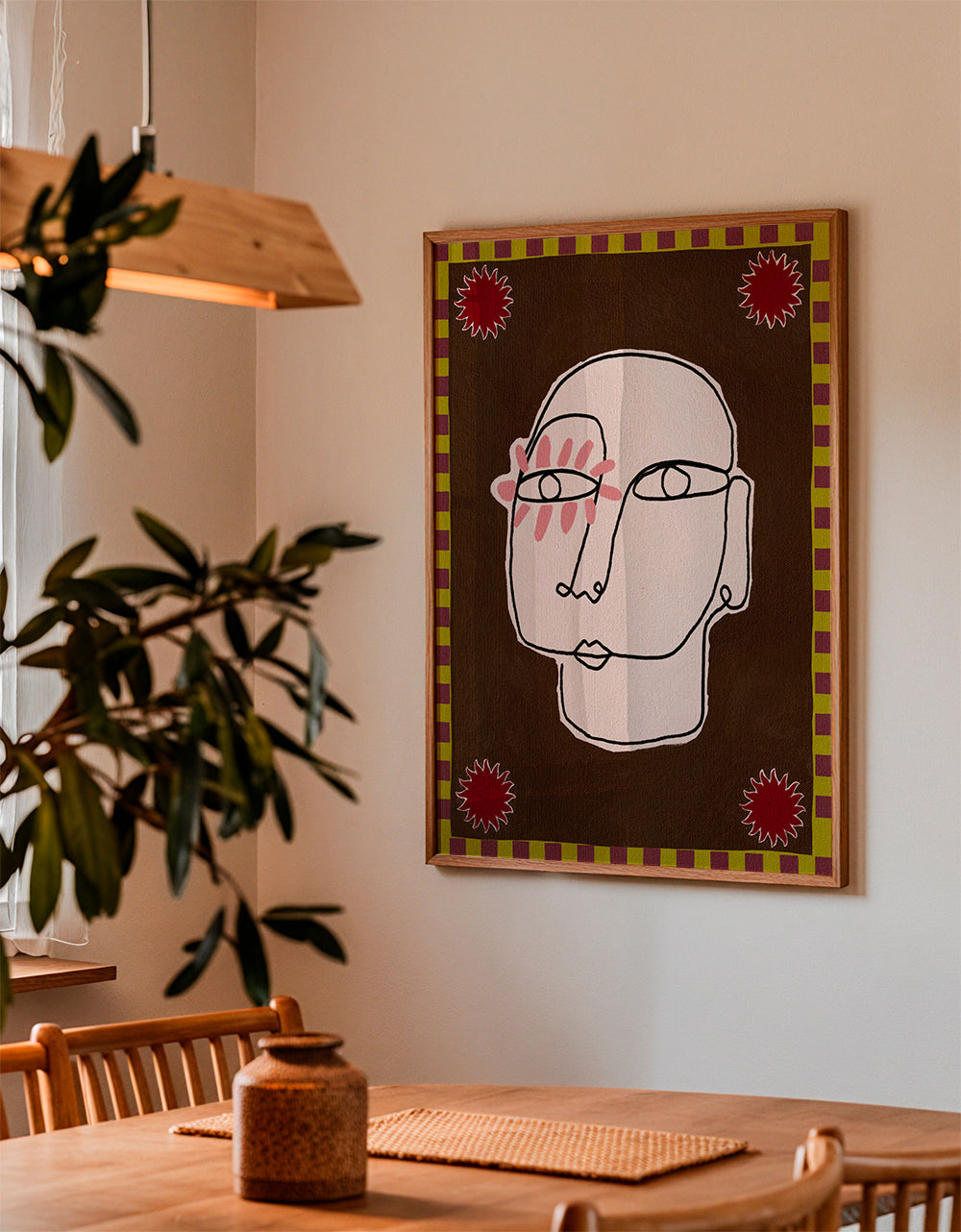 Charaktere mit Geschichte. Schöner druck Vision des Künstlers Shatha Dafai. Mit brauntöne farbtönen präsentiert in einem vertikal stil. zeichnungen und skizzen als poster sind perfekt, um deine wände auf kreative weise zu dekorieren. Werte deinen raum stilvoll auf