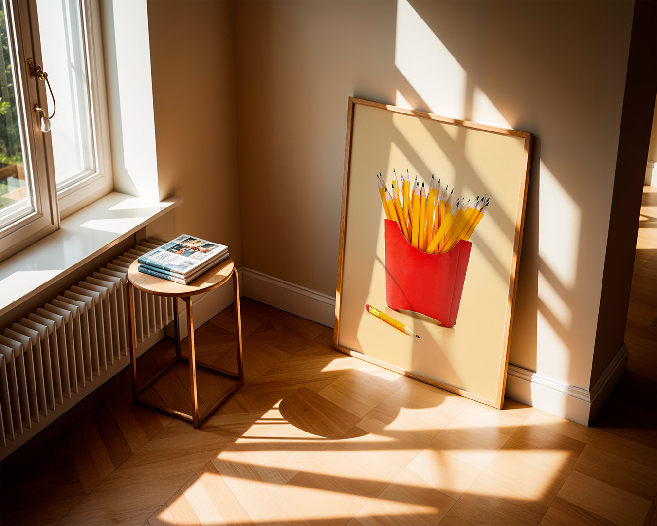 Wenn Sie die Passepartout-Option wählen, fügen wir die weiße matte Platte dem Rahmen hinzu und reduzieren das Design der Arbeit. Wählen Sie beispielsweise ein Druckformat 50x70 cm, mit eichenfarbenem Rahmen und Passepartout, reduzieren wir das Design des Druckes auf das bisherige Format (40x50cm). So passt es sich perfekt an das Innenfenster des Passepartouts an.