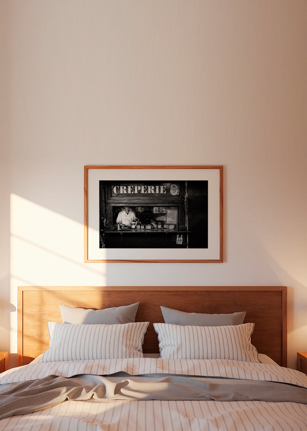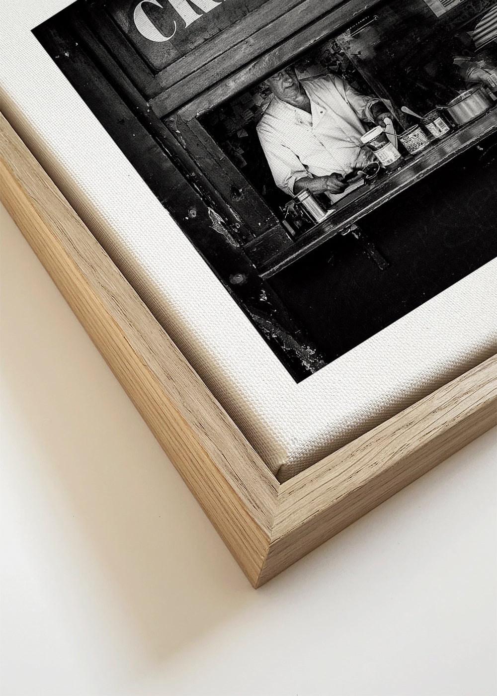 Wenn Sie die Passepartout-Option wählen, fügen wir die weiße matte Platte dem Rahmen hinzu und reduzieren das Design der Arbeit. Wählen Sie beispielsweise ein Druckformat 50x70 cm, mit eichenfarbenem Rahmen und Passepartout, reduzieren wir das Design des Druckes auf das bisherige Format (40x50cm). So passt es sich perfekt an das Innenfenster des Passepartouts an.