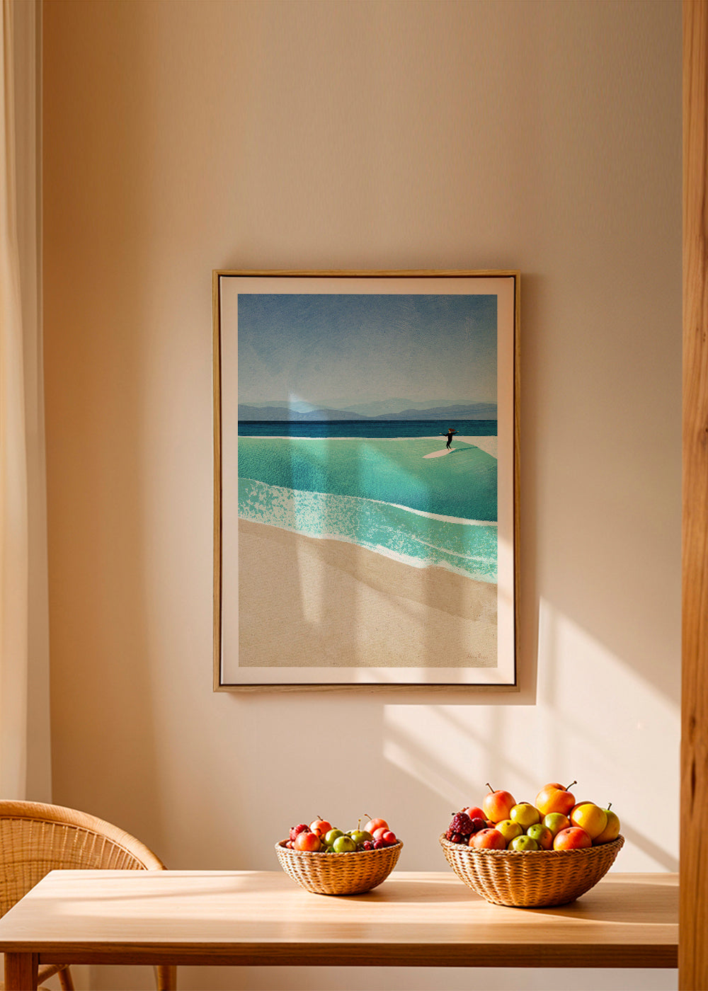 Wenn Sie die Passepartout-Option wählen, fügen wir die weiße matte Platte dem Rahmen hinzu und reduzieren das Design der Arbeit. Wählen Sie beispielsweise ein Druckformat 50x70 cm, mit eichenfarbenem Rahmen und Passepartout, reduzieren wir das Design des Druckes auf das bisherige Format (40x50cm). So passt es sich perfekt an das Innenfenster des Passepartouts an.