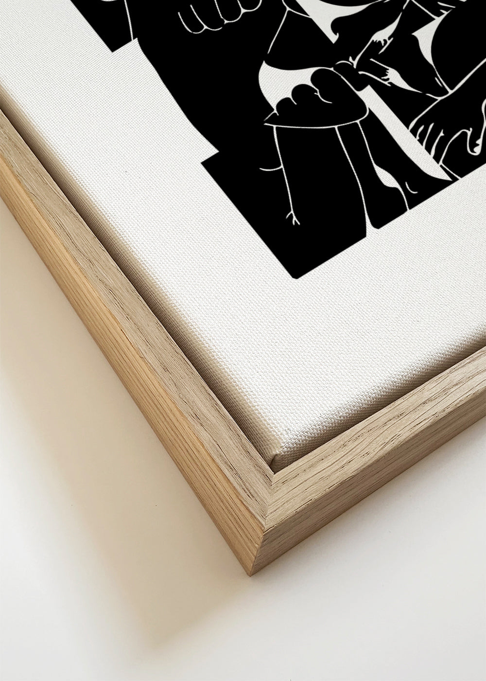 Alle unsere Rahmen werden in Spanien hergestellt. Die weißen, schwarzen und Eichenrahmen sind aus Ayous-Holz gefertigt, und die Eichenrahmen sind mit Eiche furniert, während die metallischen Rahmen aus Aluminium sind.
