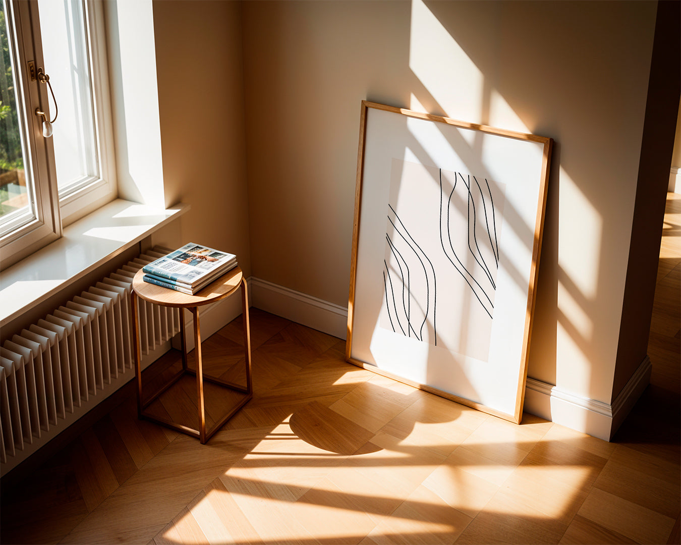 Wenn Sie die Passepartout-Option wählen, fügen wir die weiße matte Platte dem Rahmen hinzu und reduzieren das Design der Arbeit. Wählen Sie beispielsweise ein Druckformat 50x70 cm, mit eichenfarbenem Rahmen und Passepartout, reduzieren wir das Design des Druckes auf das bisherige Format (40x50cm). So passt es sich perfekt an das Innenfenster des Passepartouts an.