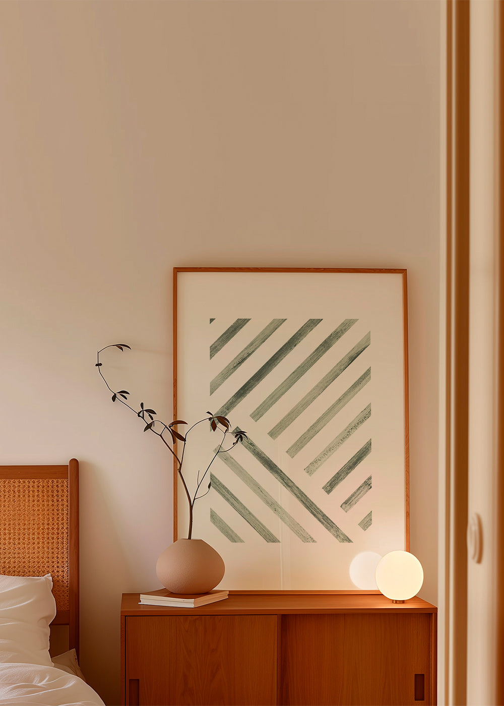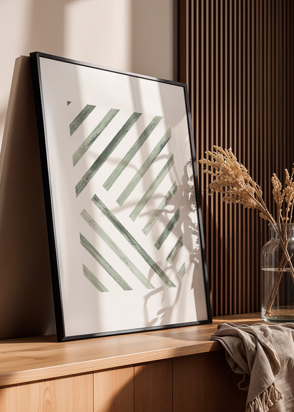 Ein Poster inspiriert durch die Kollektion von line-art-bilder, Originalbild von Bondecco, mit Schattierungen Grün, und für die Bildpositionen Vertikal. Geometrische Bilder sind eine ausgezeichnete Wahl für moderne und avantgardistische Einrichtungsstile. Eleganz inspiriert durch Kunst. Wandbild mit weißem Rand, um das Bild hervorzuheben.