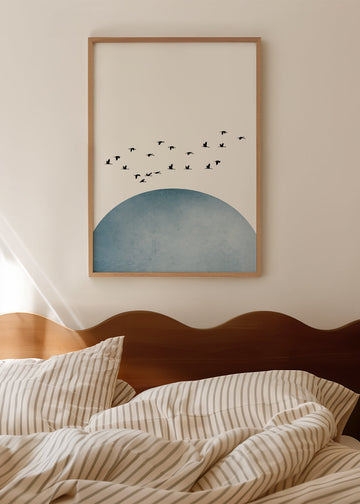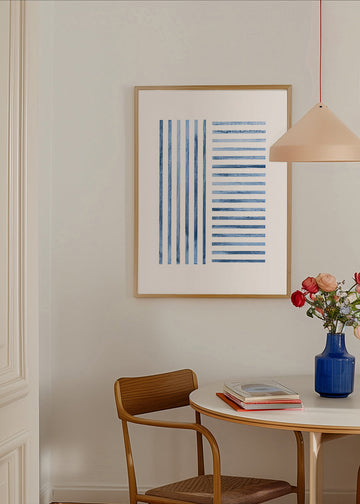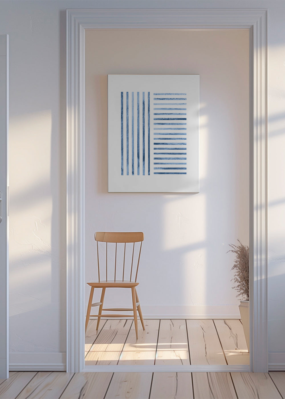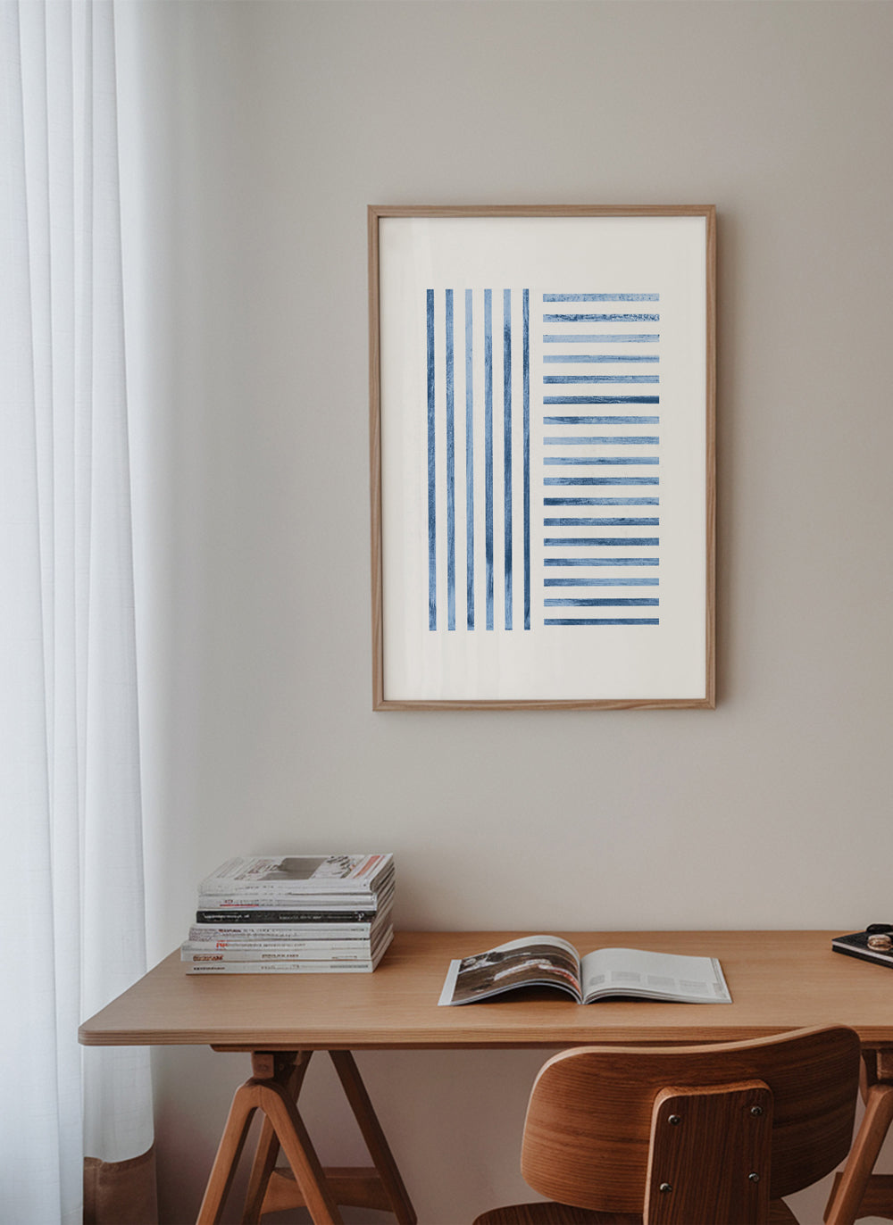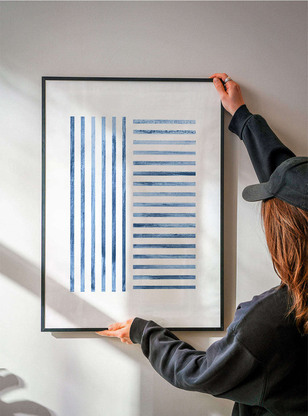 Ein Wandbild aus unserer Kunstauswahl line-art-bilder, designed von Bondecco, in den Farbtönen Blau, und mit Ausrichtung Vertikal. Abstrakte und geometrische Formen erzeugen ein verspieltes, kreatives Ambiente. Elegante Wände für schicke Wohnungen. Weiß gerahmte Bilder kommen besonders gut zum Ausdruck.