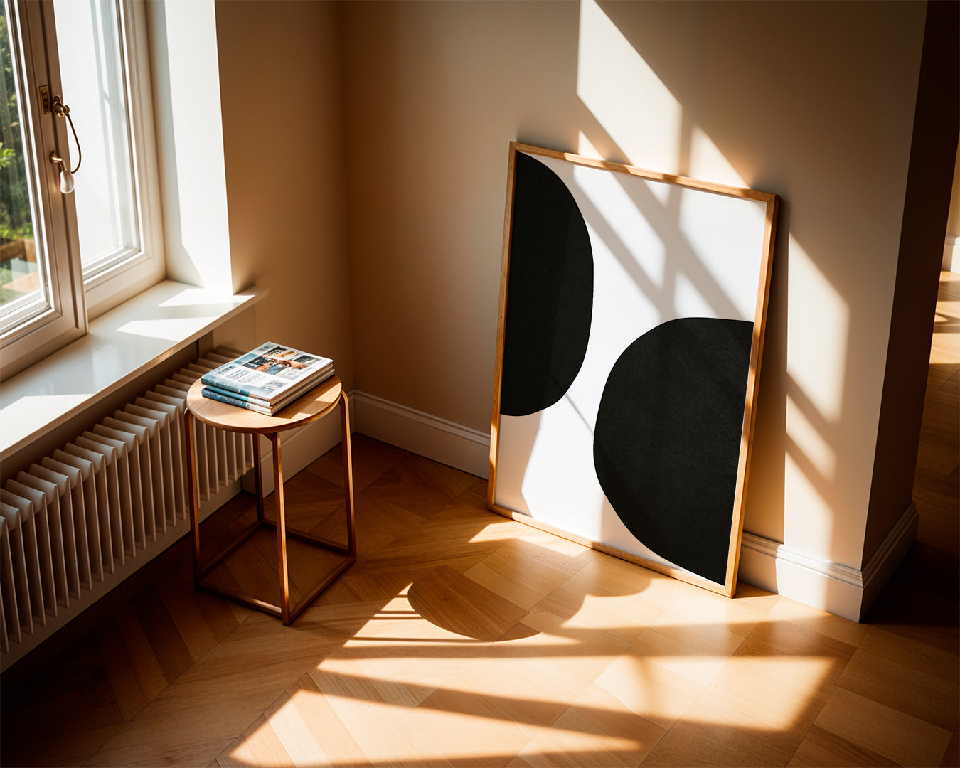 Wenn Sie die Passepartout-Option wählen, fügen wir die weiße matte Platte dem Rahmen hinzu und reduzieren das Design der Arbeit. Wählen Sie beispielsweise ein Druckformat 50x70 cm, mit eichenfarbenem Rahmen und Passepartout, reduzieren wir das Design des Druckes auf das bisherige Format (40x50cm). So passt es sich perfekt an das Innenfenster des Passepartouts an.