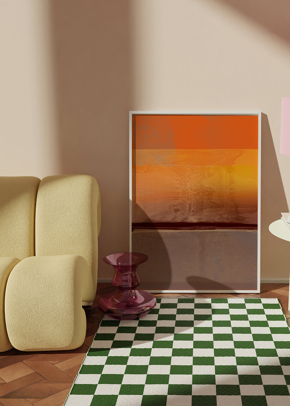Wir empfehlen den oranger Holzrahmen, der die warmen Farbtöne unterstreicht; Eiche natur mildert, schwarzes Holz definiert die Kontur.