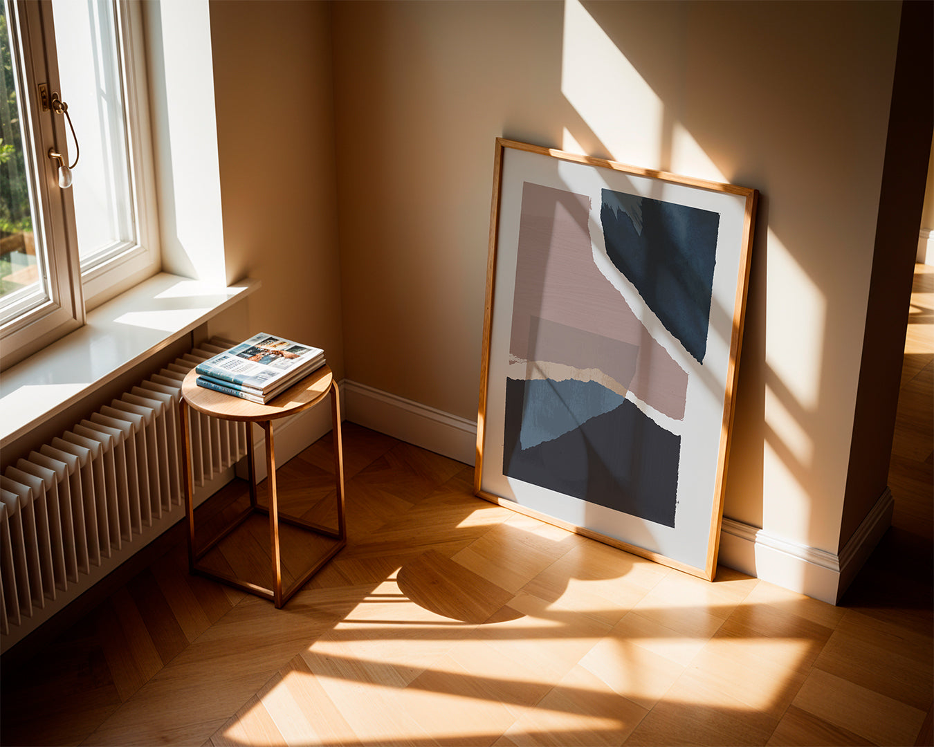 Wenn Sie die Passepartout-Option wählen, fügen wir die weiße matte Platte dem Rahmen hinzu und reduzieren das Design der Arbeit. Wählen Sie beispielsweise ein Druckformat 50x70 cm, mit eichenfarbenem Rahmen und Passepartout, reduzieren wir das Design des Druckes auf das bisherige Format (40x50cm). So passt es sich perfekt an das Innenfenster des Passepartouts an.