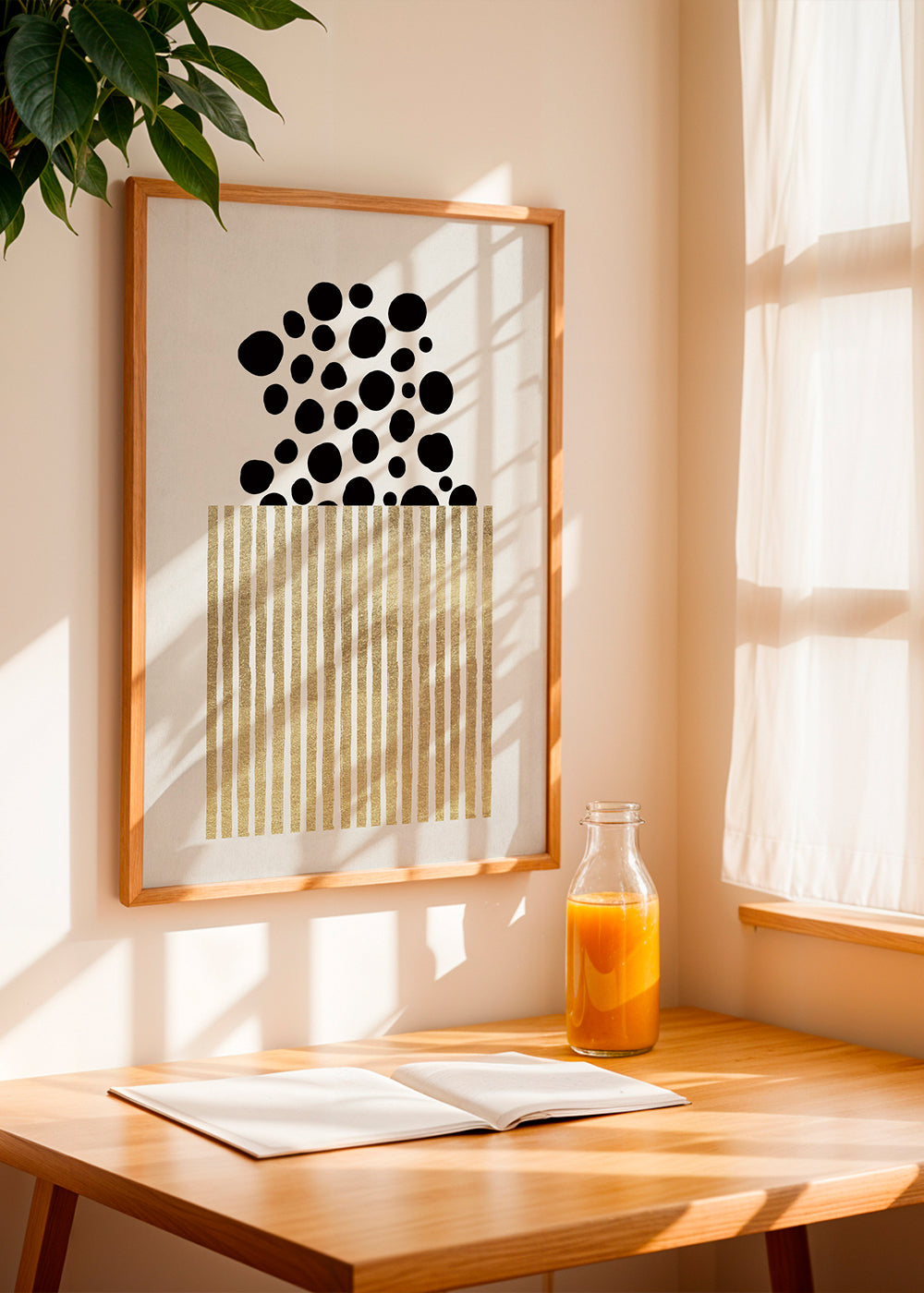 Wenn Sie die Passepartout-Option wählen, fügen wir die weiße matte Platte dem Rahmen hinzu und reduzieren das Design der Arbeit. Wählen Sie beispielsweise ein Druckformat 50x70 cm, mit eichenfarbenem Rahmen und Passepartout, reduzieren wir das Design des Druckes auf das bisherige Format (40x50cm). So passt es sich perfekt an das Innenfenster des Passepartouts an.