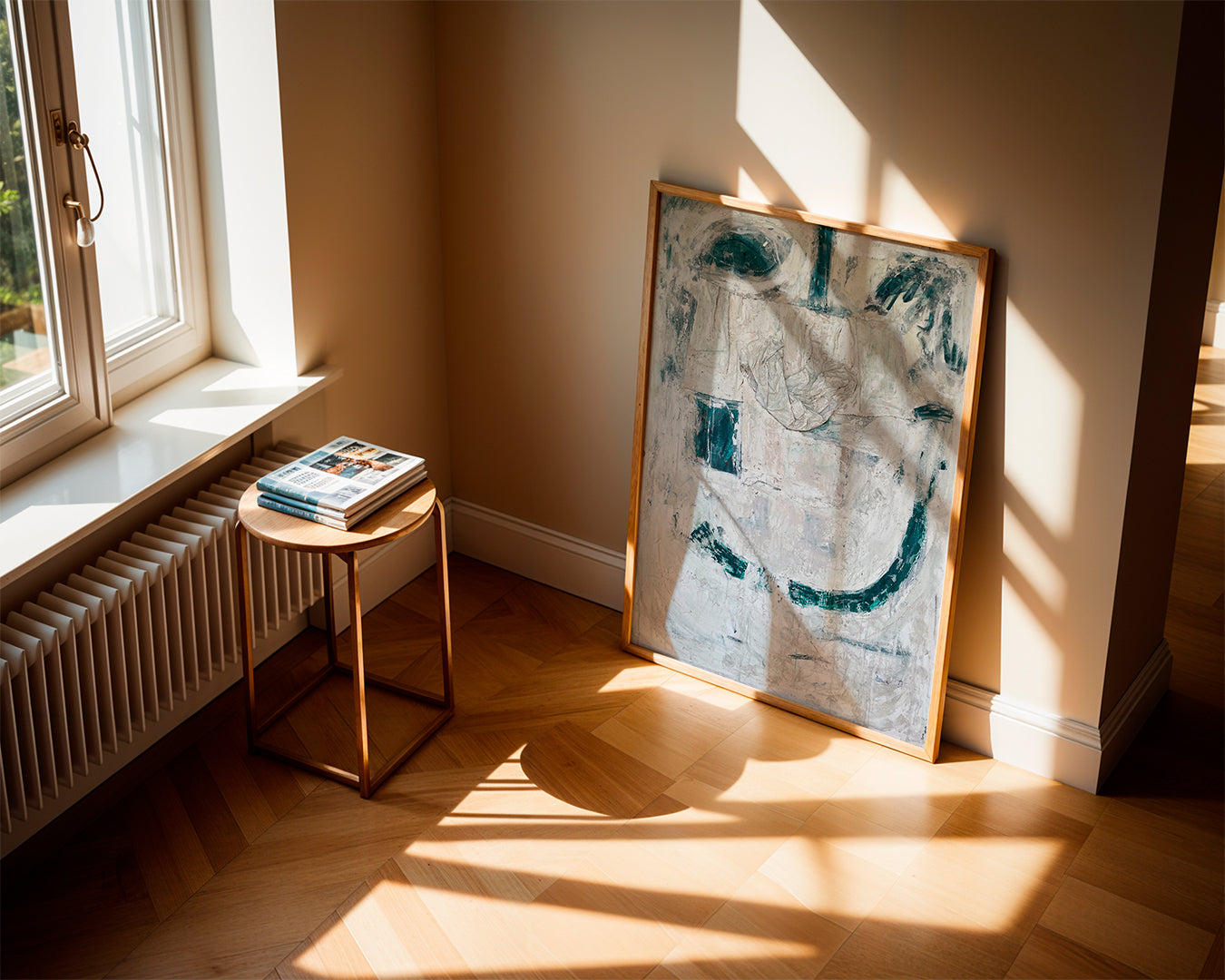 Wenn Sie die Passepartout-Option wählen, fügen wir die weiße matte Platte dem Rahmen hinzu und reduzieren das Design der Arbeit. Wählen Sie beispielsweise ein Druckformat 50x70 cm, mit eichenfarbenem Rahmen und Passepartout, reduzieren wir das Design des Druckes auf das bisherige Format (40x50cm). So passt es sich perfekt an das Innenfenster des Passepartouts an.