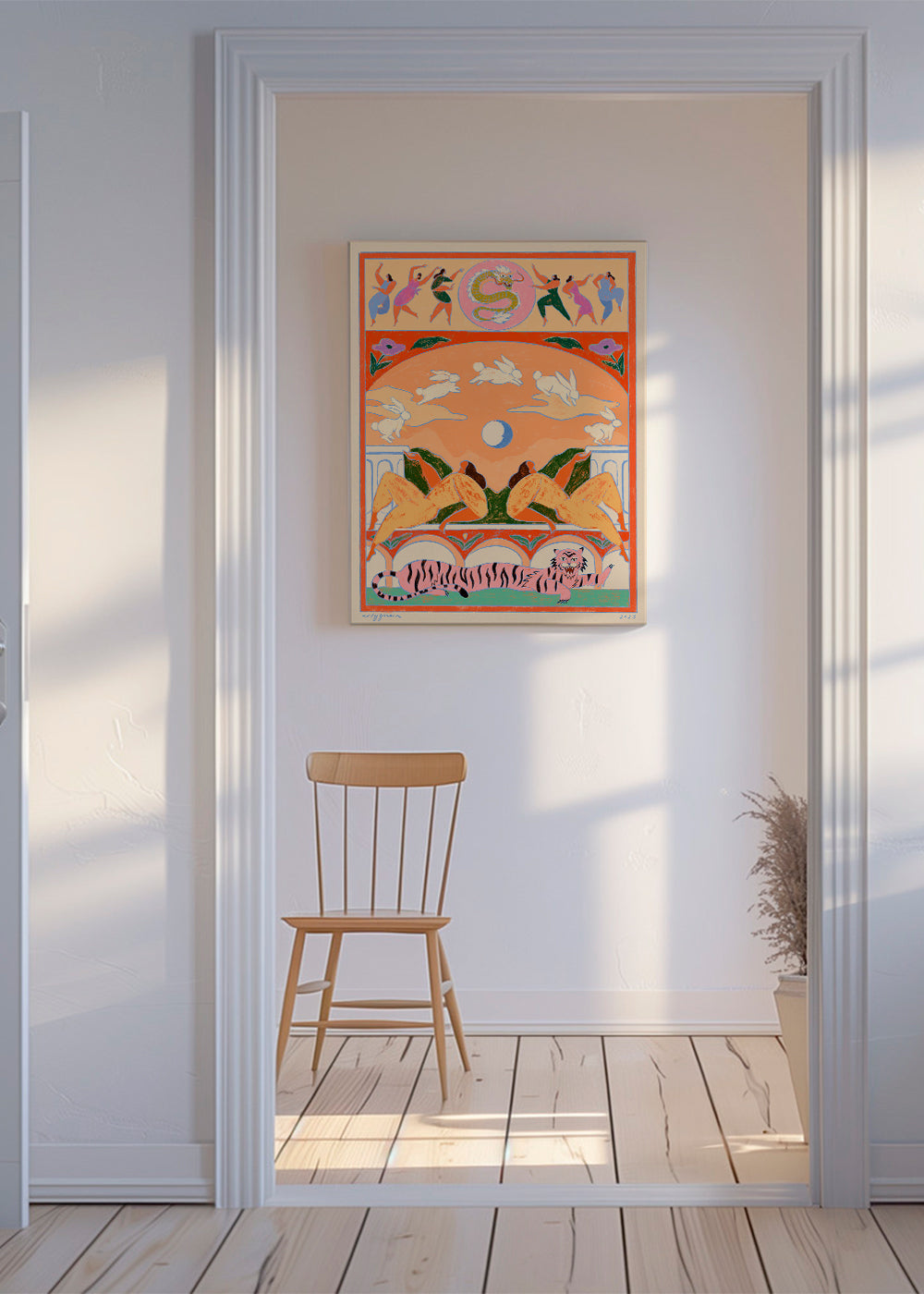 Das Passepartout ist eine weiße, matte Pappe, die das Poster umgibt, um es vor Methacrylat zu schützen, und die auch die Ausdruckskraft der Arbeit verstärkt und Details hervorhebt.
