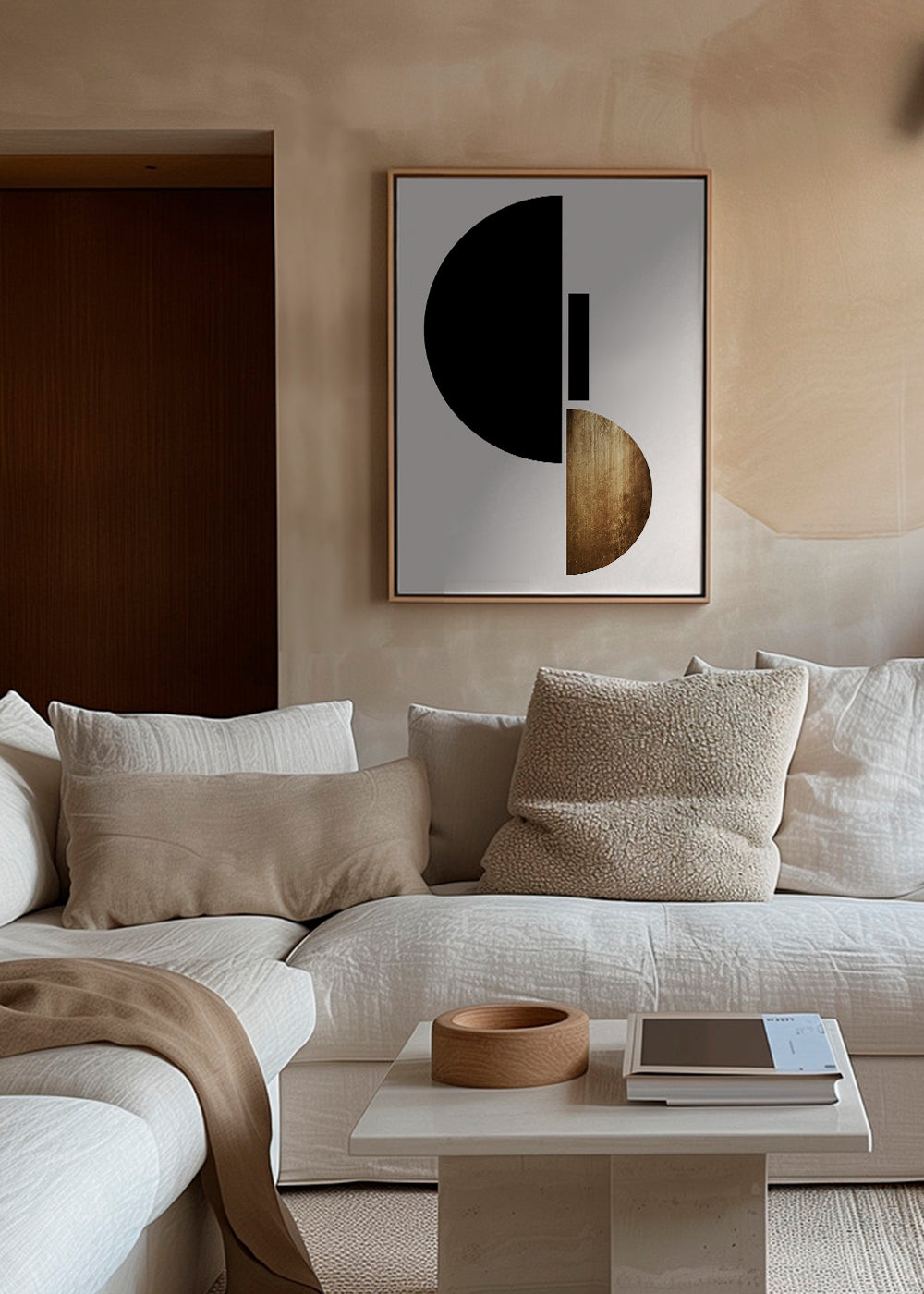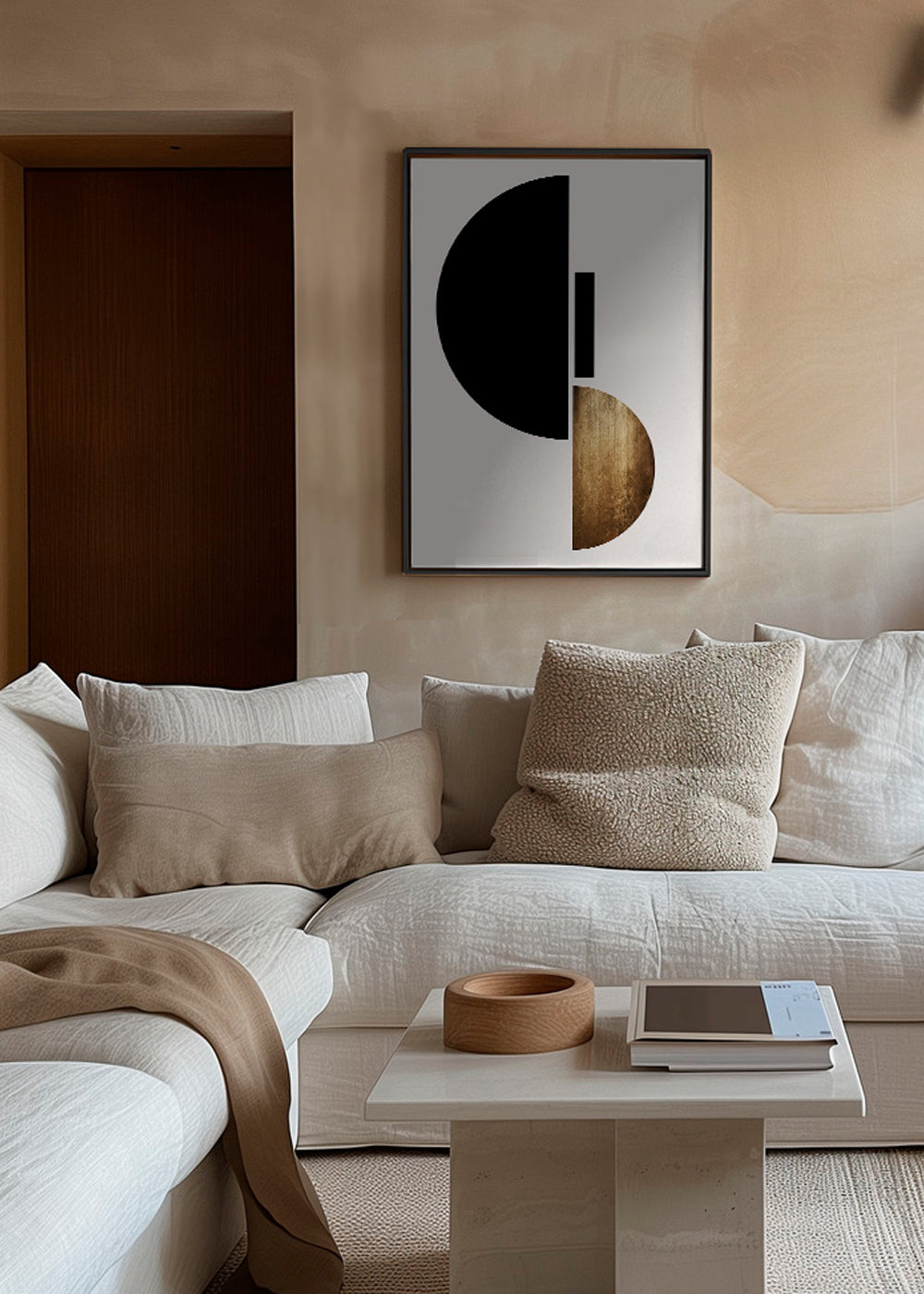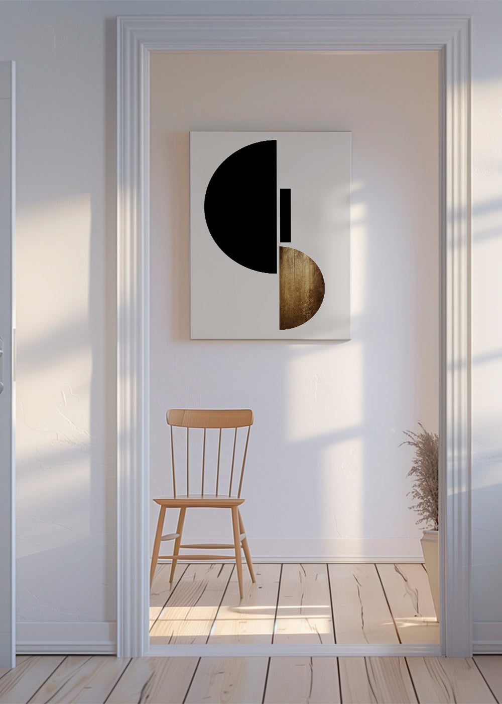 Ein Wandbild gehört zum Thema geometrische bilder, designed von Kubistika, mit Schattierungen Gold, und mit Ausrichtung Vertikal. Der Kunstdruck mit abstrakten Formen lässt sich hervorragend mit geometrischen Formen und abstrakter Kunst kombinieren. Frische und Originalität.