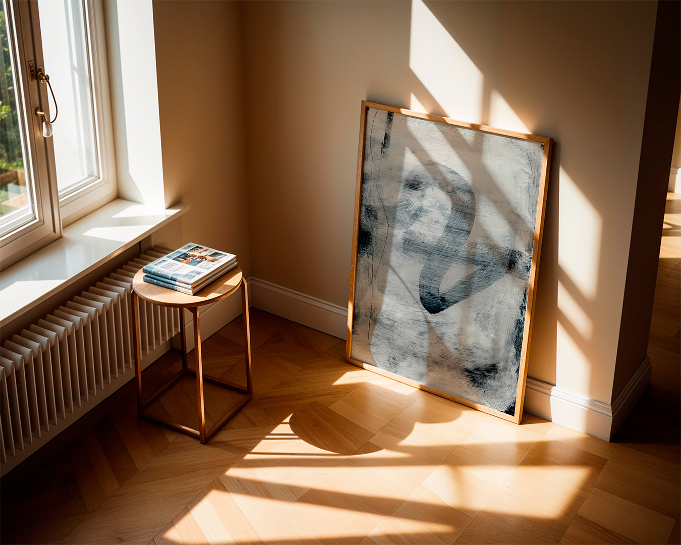 Wenn Sie die Passepartout-Option wählen, fügen wir die weiße matte Platte dem Rahmen hinzu und reduzieren das Design der Arbeit. Wählen Sie beispielsweise ein Druckformat 50x70 cm, mit eichenfarbenem Rahmen und Passepartout, reduzieren wir das Design des Druckes auf das bisherige Format (40x50cm). So passt es sich perfekt an das Innenfenster des Passepartouts an.