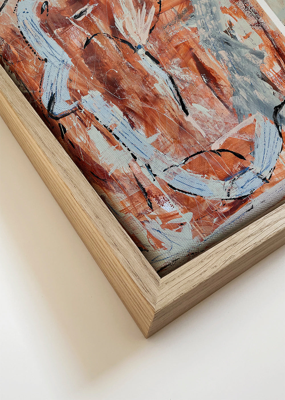 Das Passepartout ist eine weiße, matte Pappe, die das Poster umgibt, um es vor Methacrylat zu schützen, und die auch die Ausdruckskraft der Arbeit verstärkt und Details hervorhebt.
