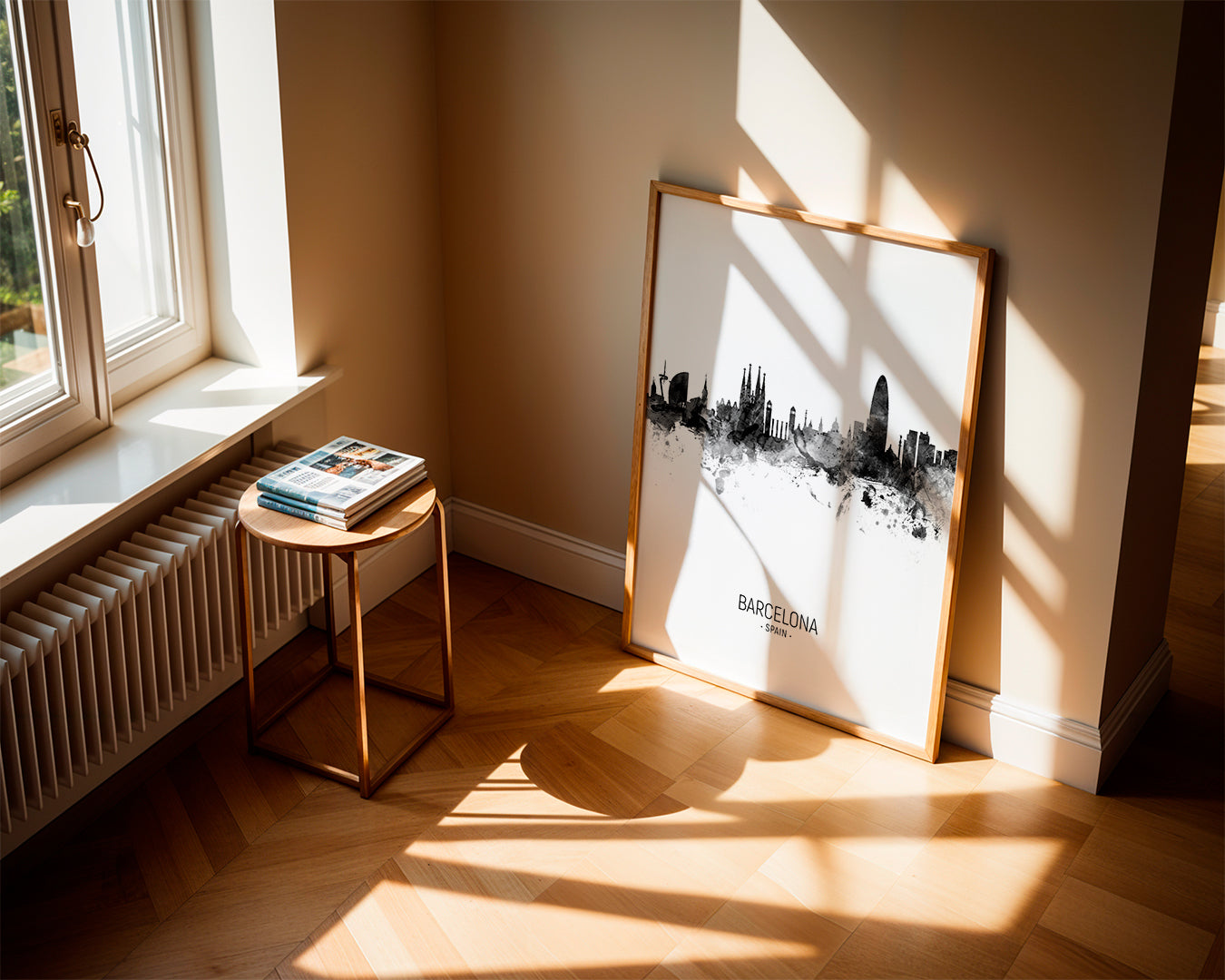 Alle unsere Rahmen werden in Spanien hergestellt. Die weißen, schwarzen und Eichenrahmen sind aus Ayous-Holz gefertigt, und die Eichenrahmen sind mit Eiche furniert, während die metallischen Rahmen aus Aluminium sind.