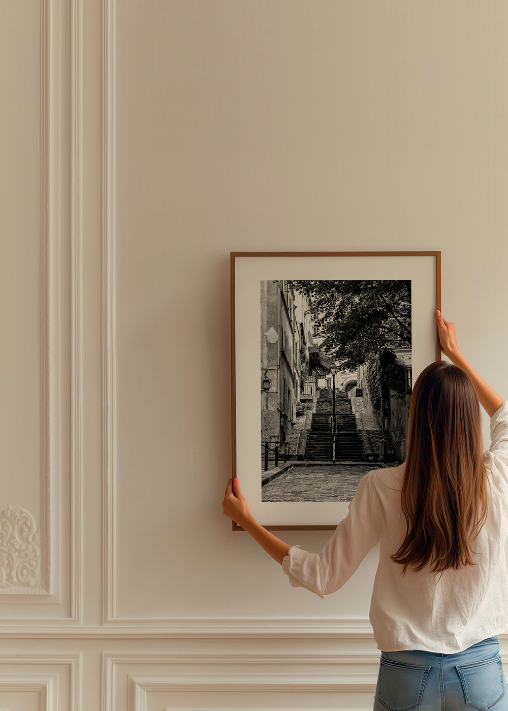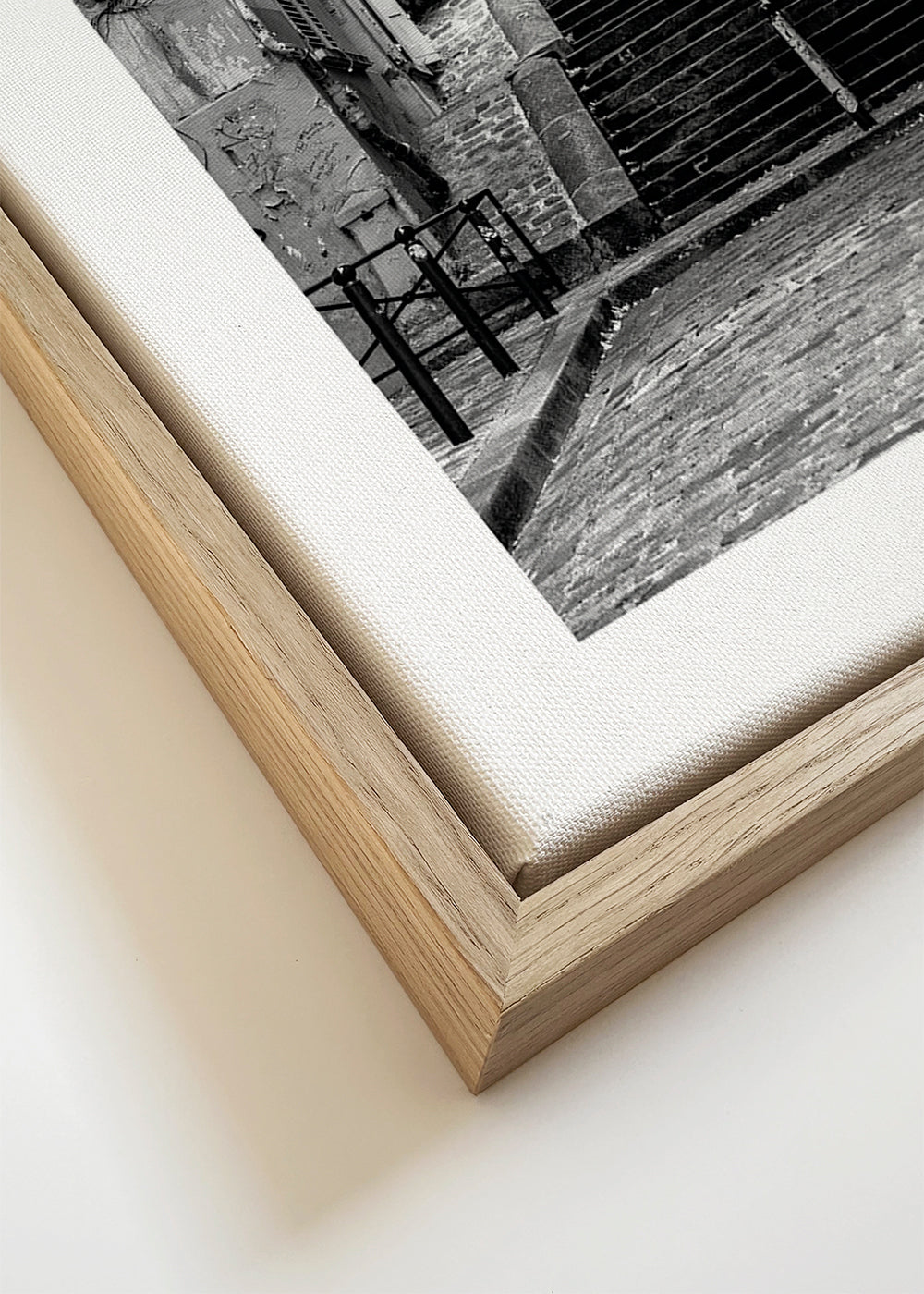 Wenn Sie die Passepartout-Option wählen, fügen wir die weiße matte Platte dem Rahmen hinzu und reduzieren das Design der Arbeit. Wählen Sie beispielsweise ein Druckformat 50x70 cm, mit eichenfarbenem Rahmen und Passepartout, reduzieren wir das Design des Druckes auf das bisherige Format (40x50cm). So passt es sich perfekt an das Innenfenster des Passepartouts an.