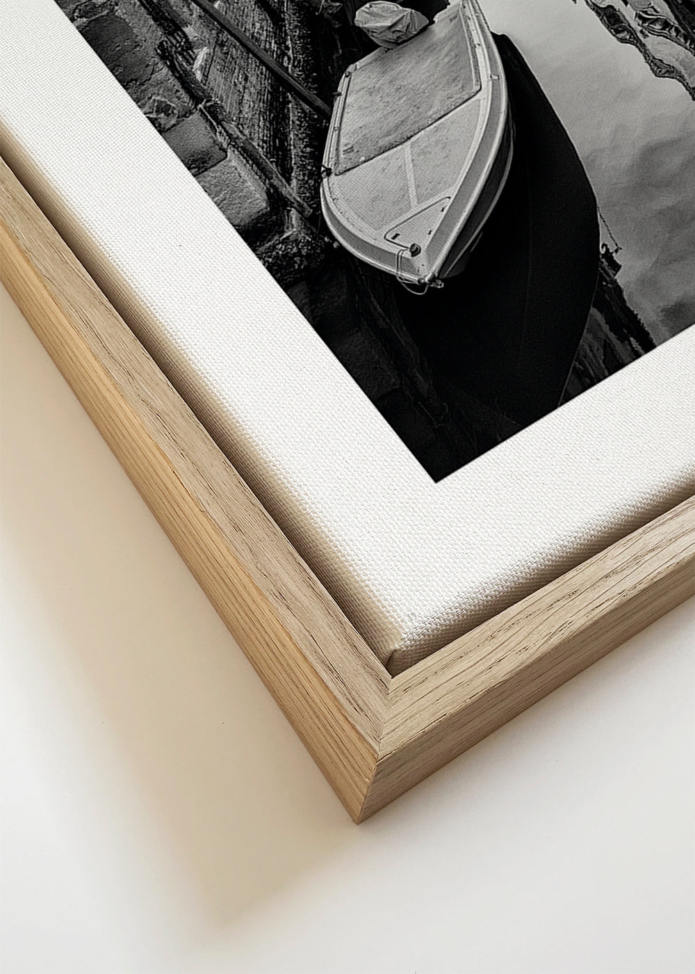 Alle unsere Rahmen werden in Spanien hergestellt. Die weißen, schwarzen und Eichenrahmen sind aus Ayous-Holz gefertigt, und die Eichenrahmen sind mit Eiche furniert, während die metallischen Rahmen aus Aluminium sind.