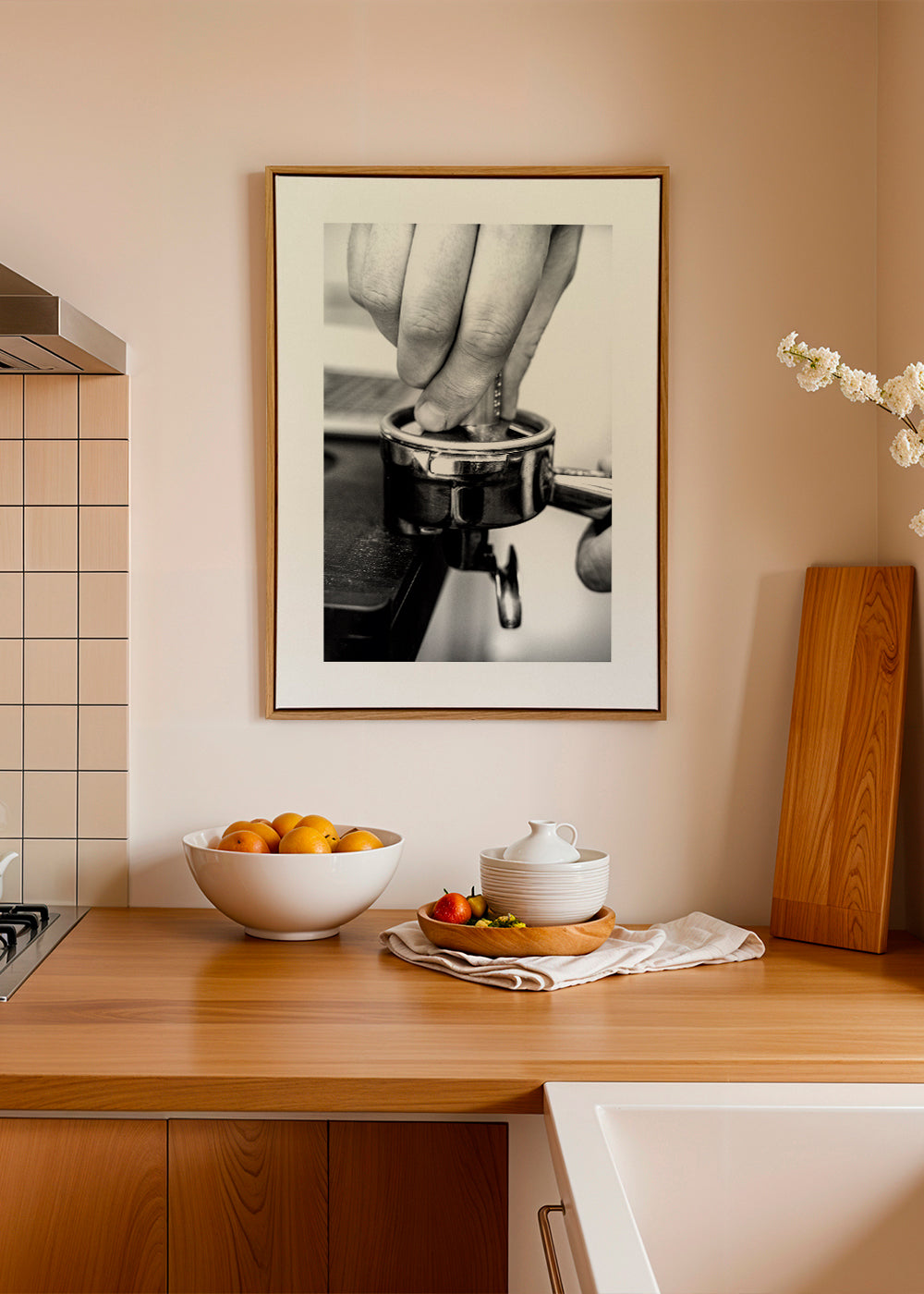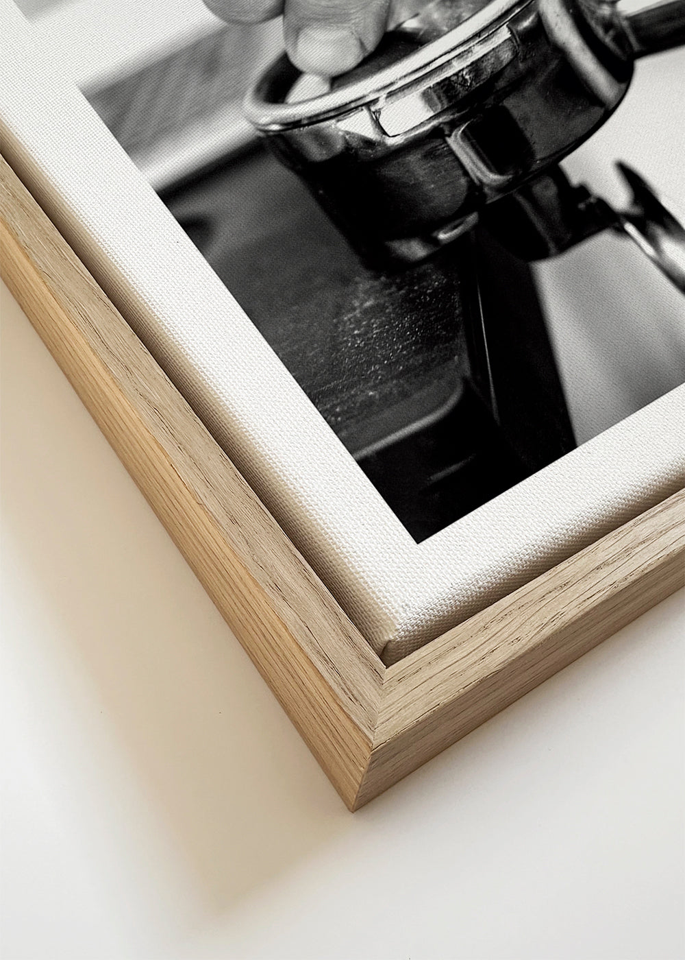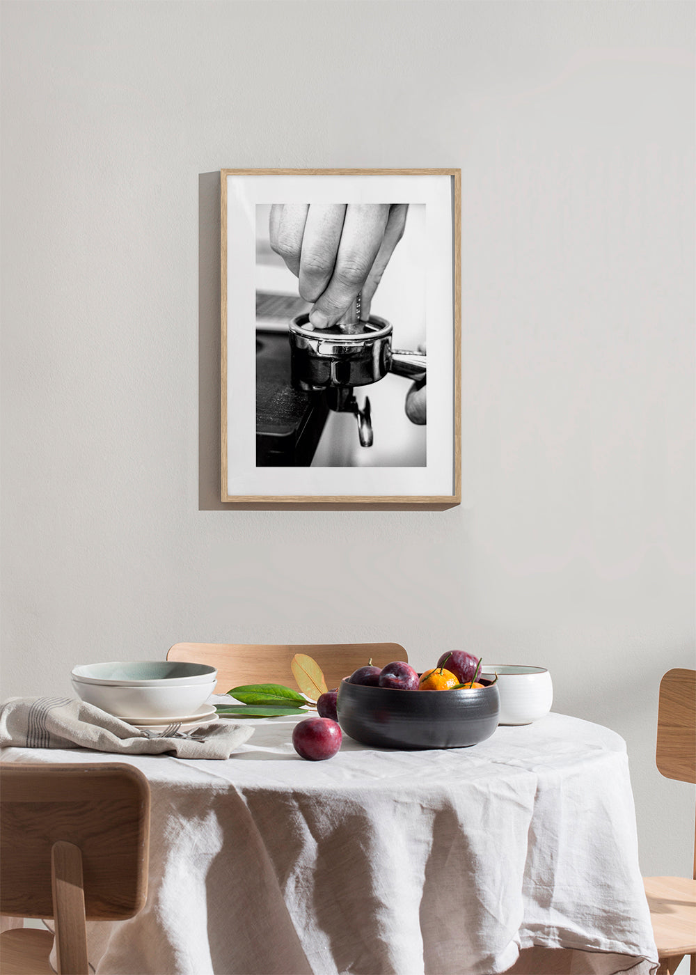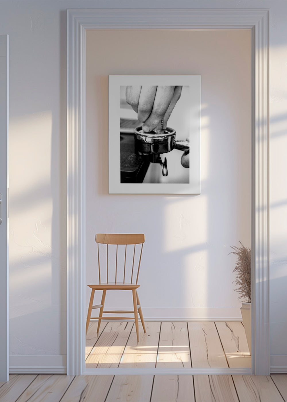 Ein Kunstdruck aus unserer Themengruppe kaffee-poster und bilder mit kaffee-motiven, kreiert von 1x, mit Nuancen schwarz-weiß, und für die Bildpositionen vertikal. Die perfekte Fotografie, um sie zusammen mit anderen gerahmten Fotodrucken an die Wand zu hängen. Unverfälschte Kunst und authentisches Design. Das Wandbild wird mit weißem Bilderrahmen geliefert, der das Kunstwerk richtig in Szene setzt.