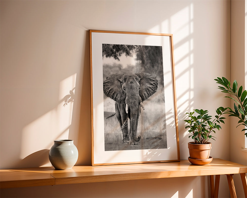 Schönes Designs aus unserer Themengruppe elefanten-bilder und poster, kreiert von 1x, in den Farbtönen Schwarz-weiß, und im Format Vertikal. Wandbilder mit Tiermotiven sind ideal, um unsere Verbundenheit mit der Natur an unseren Wänden auszudrücken. Richte deine eigene, inspirierende Kunstecke ein. Wandbild mit weißem Rand, um das Bild hervorzuheben.