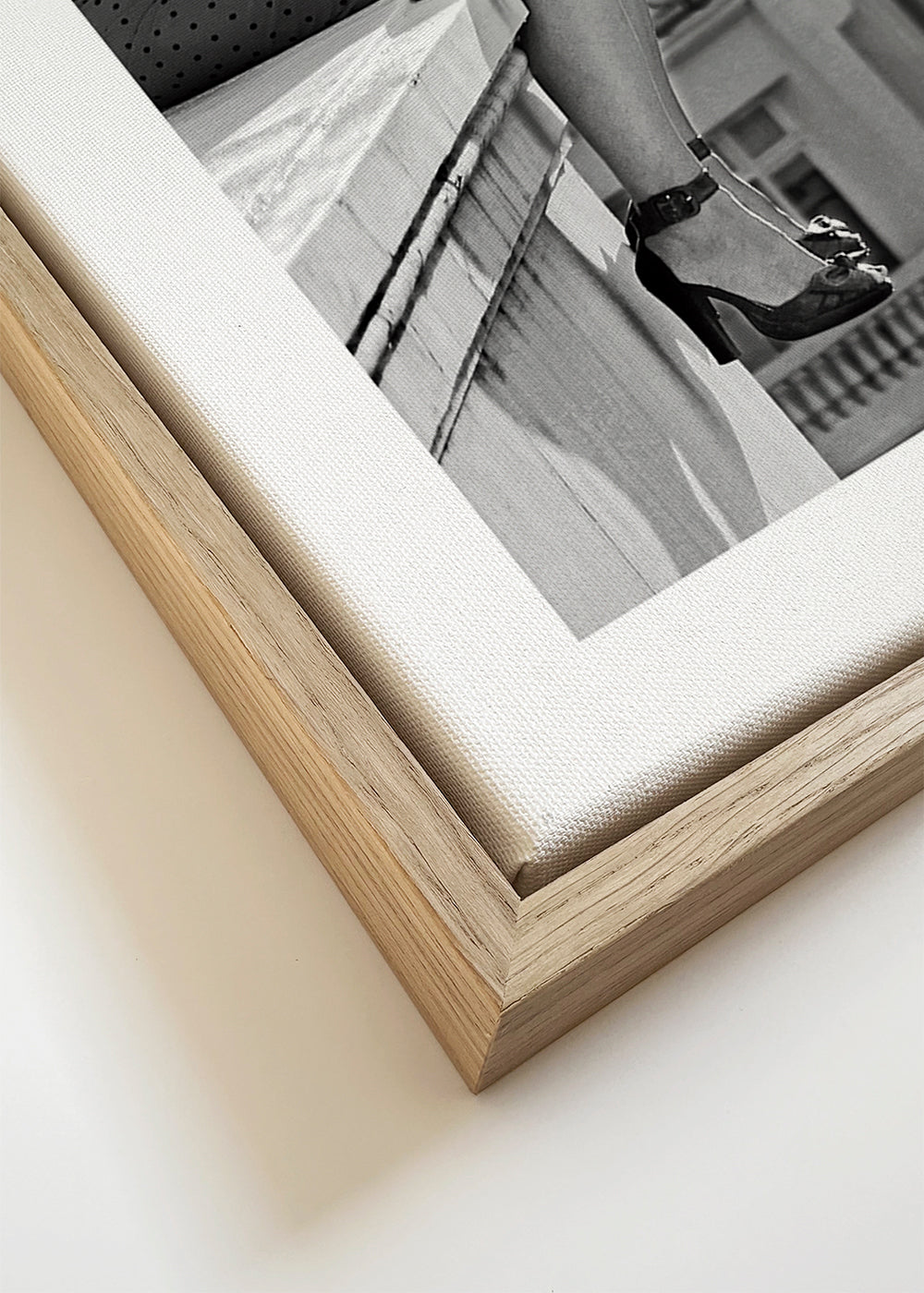 Wenn Sie die Passepartout-Option wählen, fügen wir die weiße matte Platte dem Rahmen hinzu und reduzieren das Design der Arbeit. Wählen Sie beispielsweise ein Druckformat 50x70 cm, mit eichenfarbenem Rahmen und Passepartout, reduzieren wir das Design des Druckes auf das bisherige Format (40x50cm). So passt es sich perfekt an das Innenfenster des Passepartouts an.
