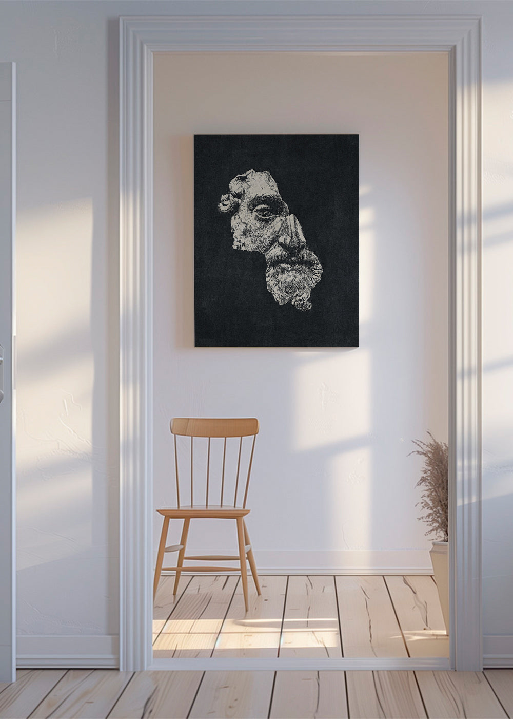 Ein Kunstwerk aus unserer Kunstauswahl bilder mit gesichtern, Originalbild von Daniel Coulmann, mit Farben schwarz-weiß, und im Format vertikal. Die Wohnung in Schwarz und Weiß einrichten: mit schwarz-weißen Wandbildern leicht gemacht! Verschönere deine Inneneinrichtung mit Kunst.