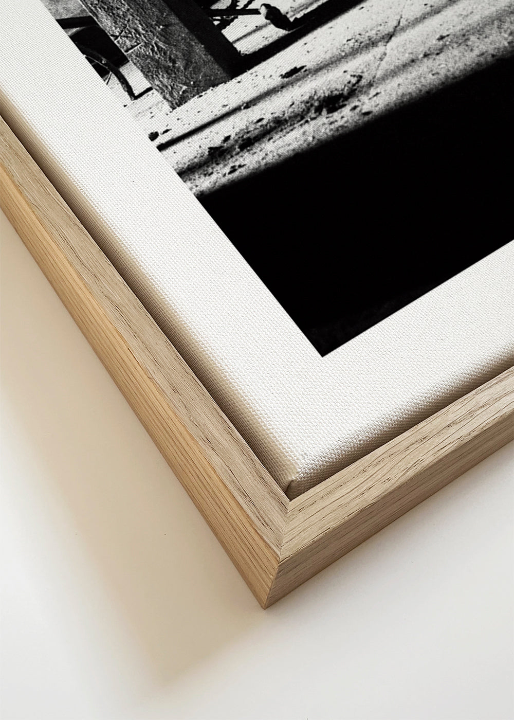 Wir arbeiten mit Massivholz- und Aluminiumrahmen. Alle gerahmten Produkte werden bereits montiert und fertig zum Aufhängen geliefert. Die Frontabdeckung besteht aus transparentem Acrylglas.