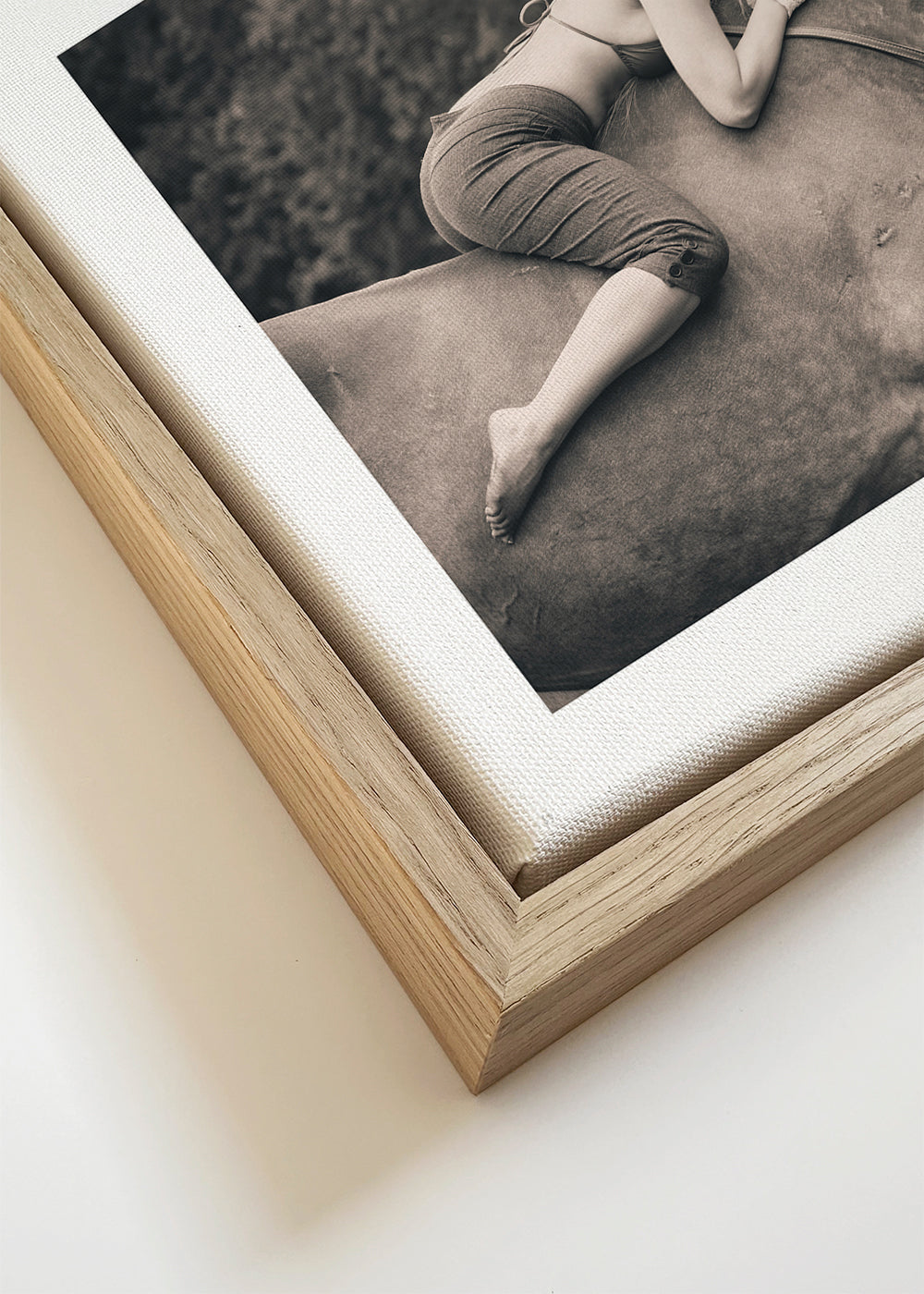 Wenn Sie die Passepartout-Option wählen, fügen wir die weiße matte Platte dem Rahmen hinzu und reduzieren das Design der Arbeit. Wählen Sie beispielsweise ein Druckformat 50x70 cm, mit eichenfarbenem Rahmen und Passepartout, reduzieren wir das Design des Druckes auf das bisherige Format (40x50cm). So passt es sich perfekt an das Innenfenster des Passepartouts an.