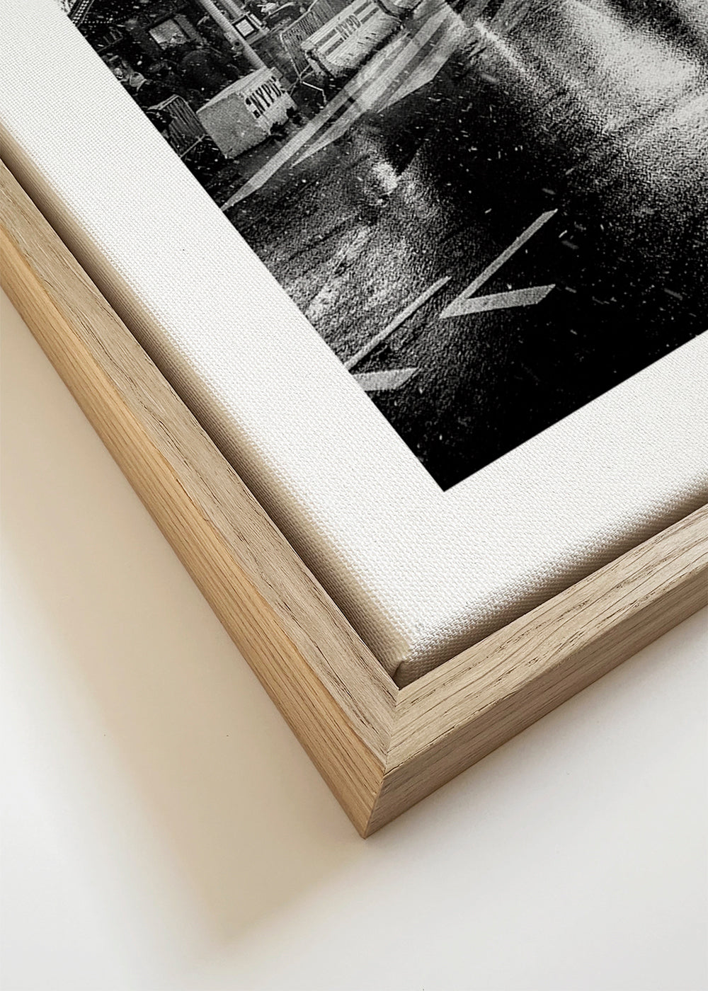 Wenn Sie die Passepartout-Option wählen, fügen wir die weiße matte Platte dem Rahmen hinzu und reduzieren das Design der Arbeit. Wählen Sie beispielsweise ein Druckformat 50x70 cm, mit eichenfarbenem Rahmen und Passepartout, reduzieren wir das Design des Druckes auf das bisherige Format (40x50cm). So passt es sich perfekt an das Innenfenster des Passepartouts an.