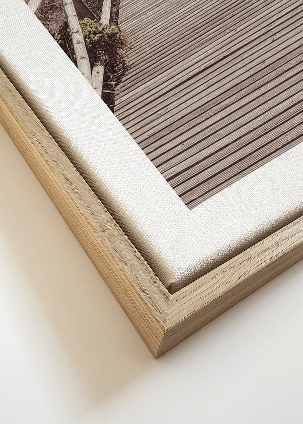 Alle unsere Rahmen werden in Spanien hergestellt. Die weißen, schwarzen und Eichenrahmen sind aus Ayous-Holz gefertigt, und die Eichenrahmen sind mit Eiche furniert, während die metallischen Rahmen aus Aluminium sind.