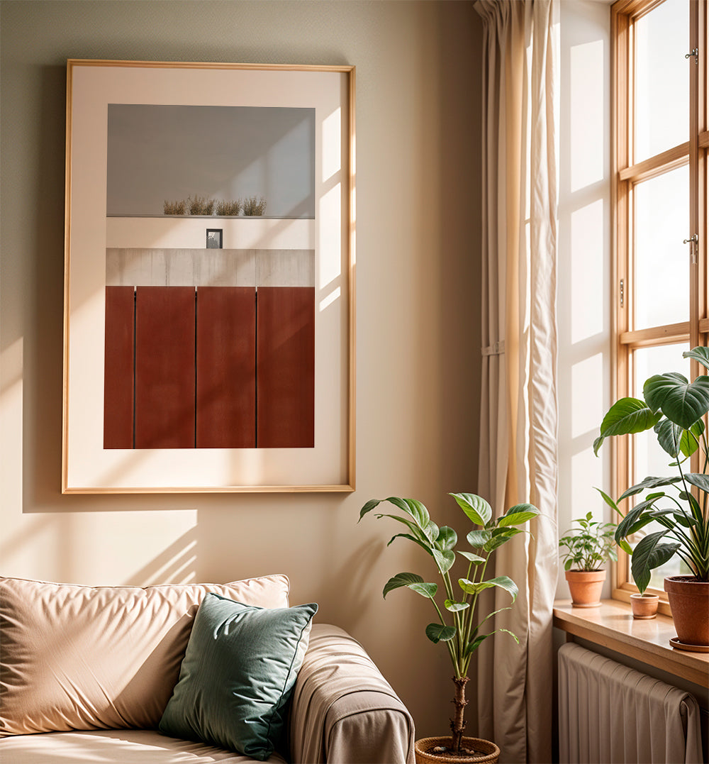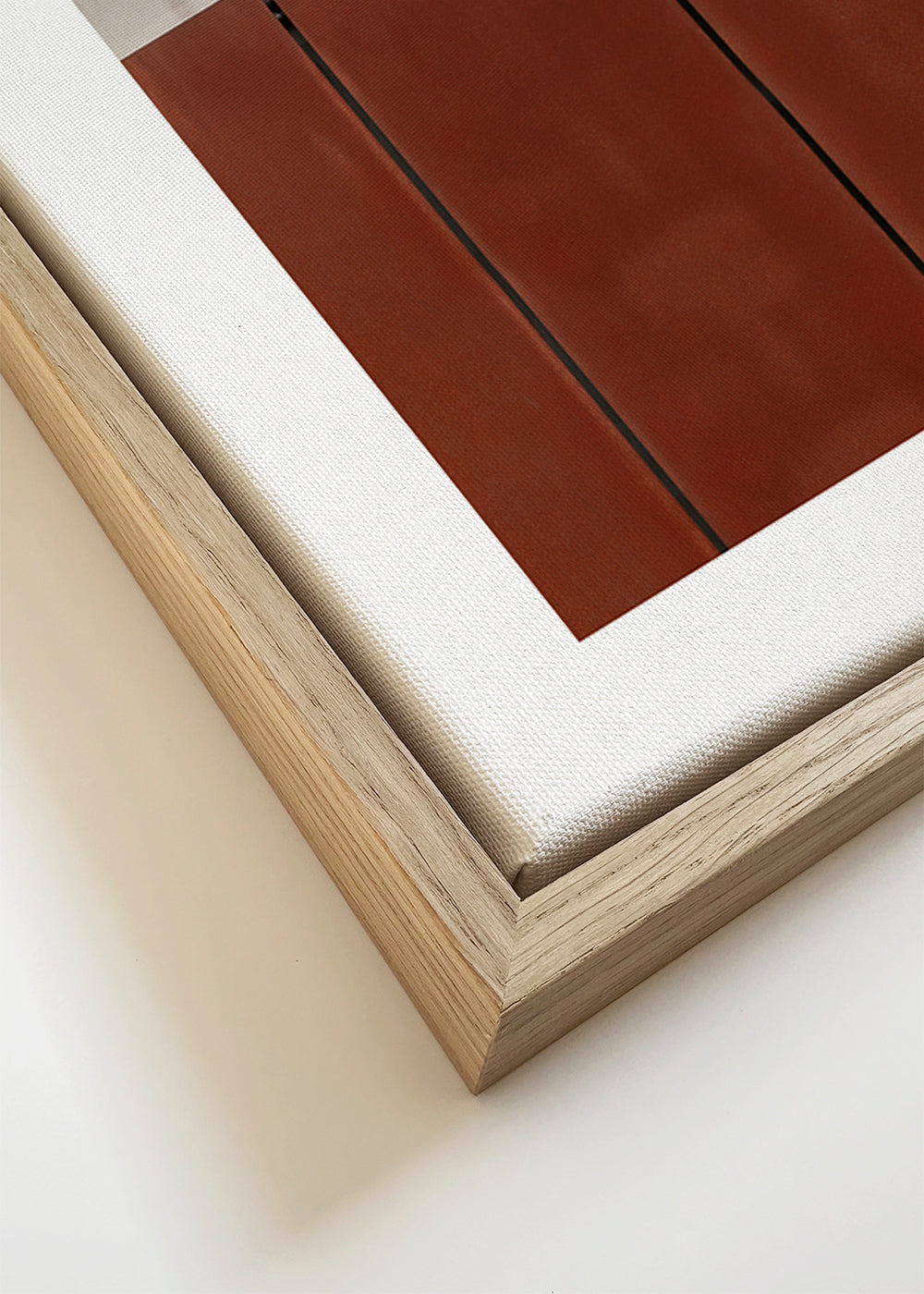 Wenn Sie die Passepartout-Option wählen, fügen wir die weiße matte Platte dem Rahmen hinzu und reduzieren das Design der Arbeit. Wählen Sie beispielsweise ein Druckformat 50x70 cm, mit eichenfarbenem Rahmen und Passepartout, reduzieren wir das Design des Druckes auf das bisherige Format (40x50cm). So passt es sich perfekt an das Innenfenster des Passepartouts an.