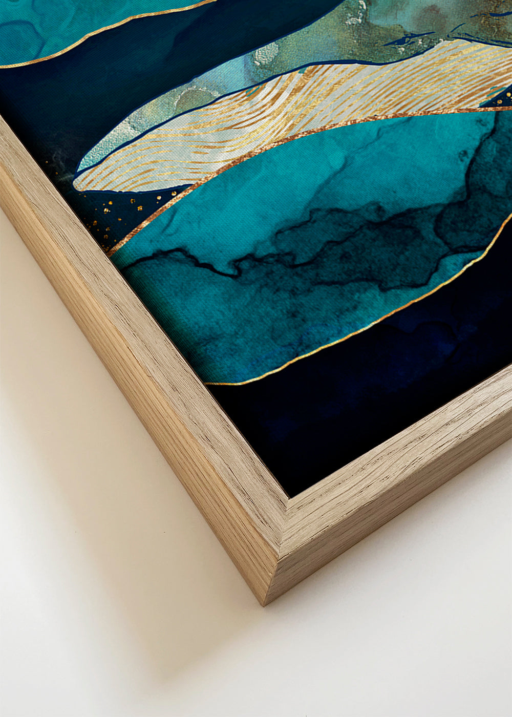 Wir arbeiten mit Massivholz- und Aluminiumrahmen. Alle gerahmten Produkte werden bereits montiert und fertig zum Aufhängen geliefert. Die Frontabdeckung besteht aus transparentem Acrylglas.