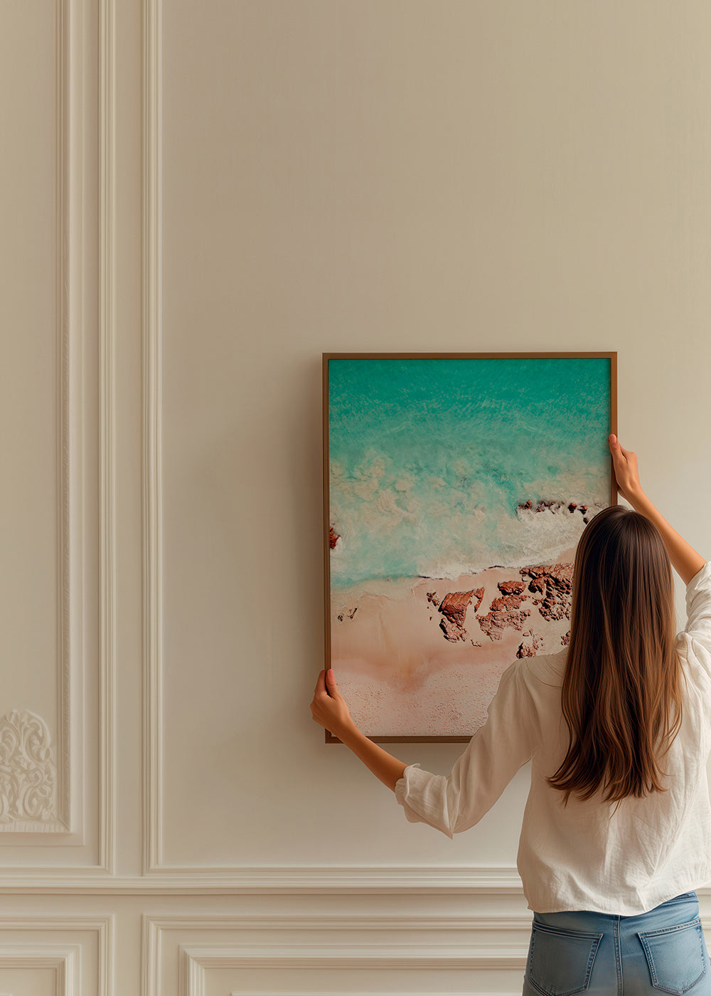 Wenn Sie die Passepartout-Option wählen, fügen wir die weiße matte Platte dem Rahmen hinzu und reduzieren das Design der Arbeit. Wählen Sie beispielsweise ein Druckformat 50x70 cm, mit eichenfarbenem Rahmen und Passepartout, reduzieren wir das Design des Druckes auf das bisherige Format (40x50cm). So passt es sich perfekt an das Innenfenster des Passepartouts an.