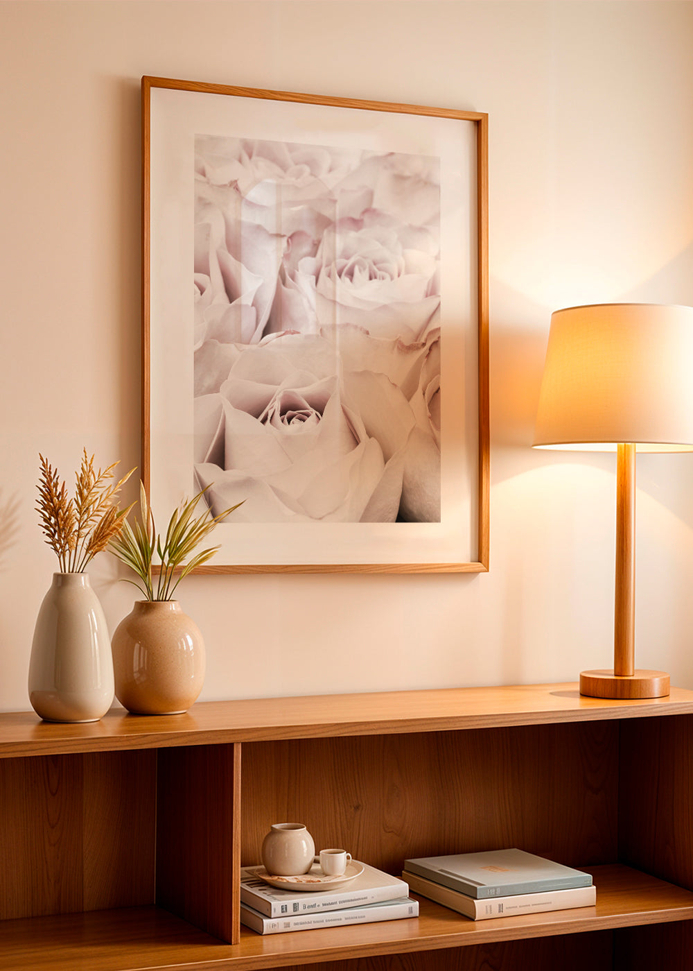 Wenn Sie die Passepartout-Option wählen, fügen wir die weiße matte Platte dem Rahmen hinzu und reduzieren das Design der Arbeit. Wählen Sie beispielsweise ein Druckformat 50x70 cm, mit eichenfarbenem Rahmen und Passepartout, reduzieren wir das Design des Druckes auf das bisherige Format (40x50cm). So passt es sich perfekt an das Innenfenster des Passepartouts an.