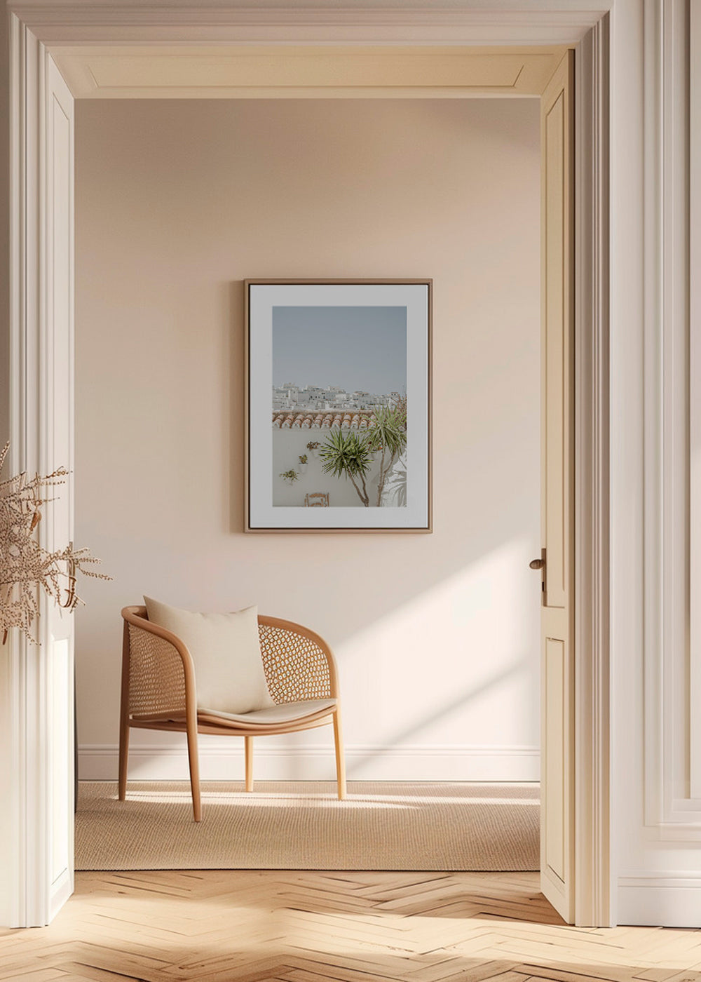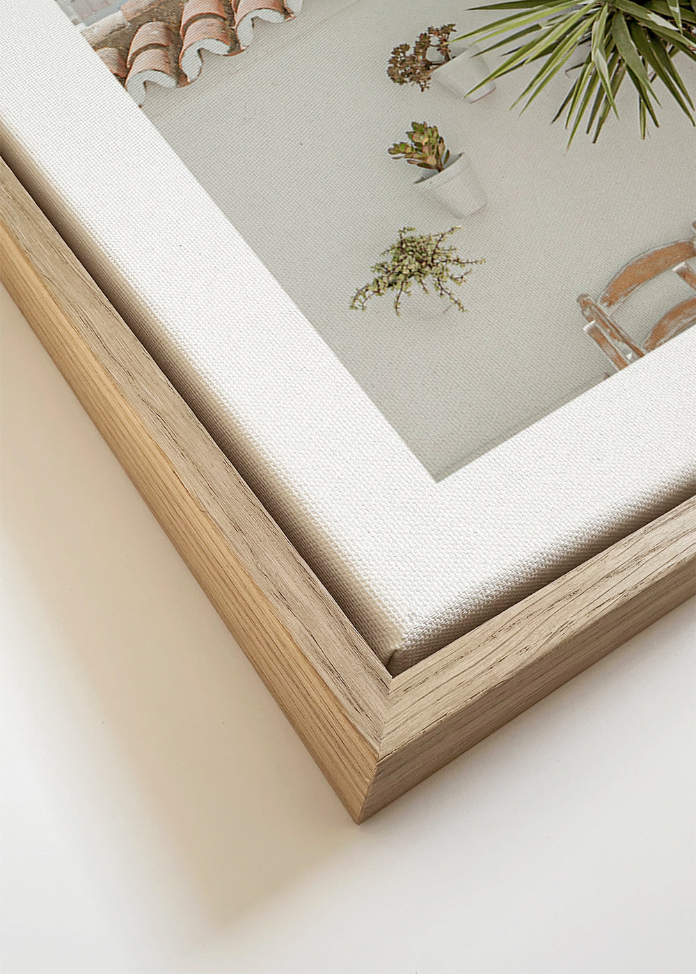 Wenn Sie die Passepartout-Option wählen, fügen wir die weiße matte Platte dem Rahmen hinzu und reduzieren das Design der Arbeit. Wählen Sie beispielsweise ein Druckformat 50x70 cm, mit eichenfarbenem Rahmen und Passepartout, reduzieren wir das Design des Druckes auf das bisherige Format (40x50cm). So passt es sich perfekt an das Innenfenster des Passepartouts an.