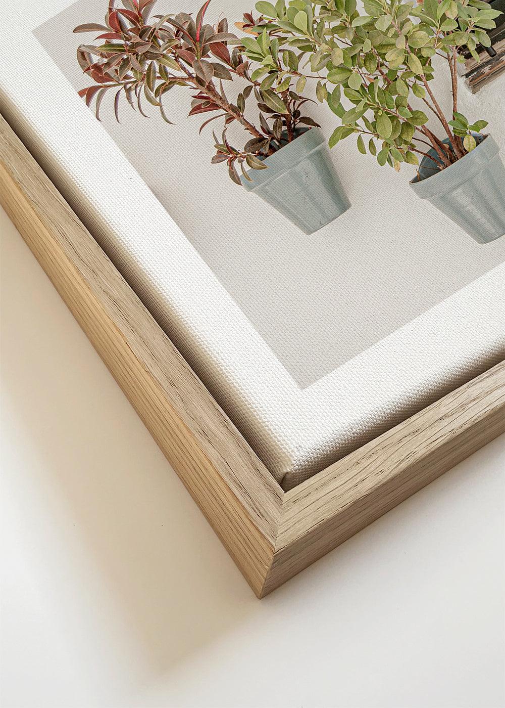 Alle unsere Rahmen werden in Spanien hergestellt. Die weißen, schwarzen und Eichenrahmen sind aus Ayous-Holz gefertigt, und die Eichenrahmen sind mit Eiche furniert, während die metallischen Rahmen aus Aluminium sind.