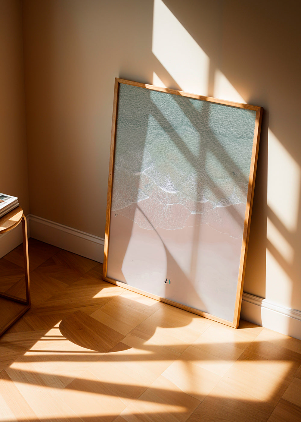 Wenn Sie die Passepartout-Option wählen, fügen wir die weiße matte Platte dem Rahmen hinzu und reduzieren das Design der Arbeit. Wählen Sie beispielsweise ein Druckformat 50x70 cm, mit eichenfarbenem Rahmen und Passepartout, reduzieren wir das Design des Druckes auf das bisherige Format (40x50cm). So passt es sich perfekt an das Innenfenster des Passepartouts an.