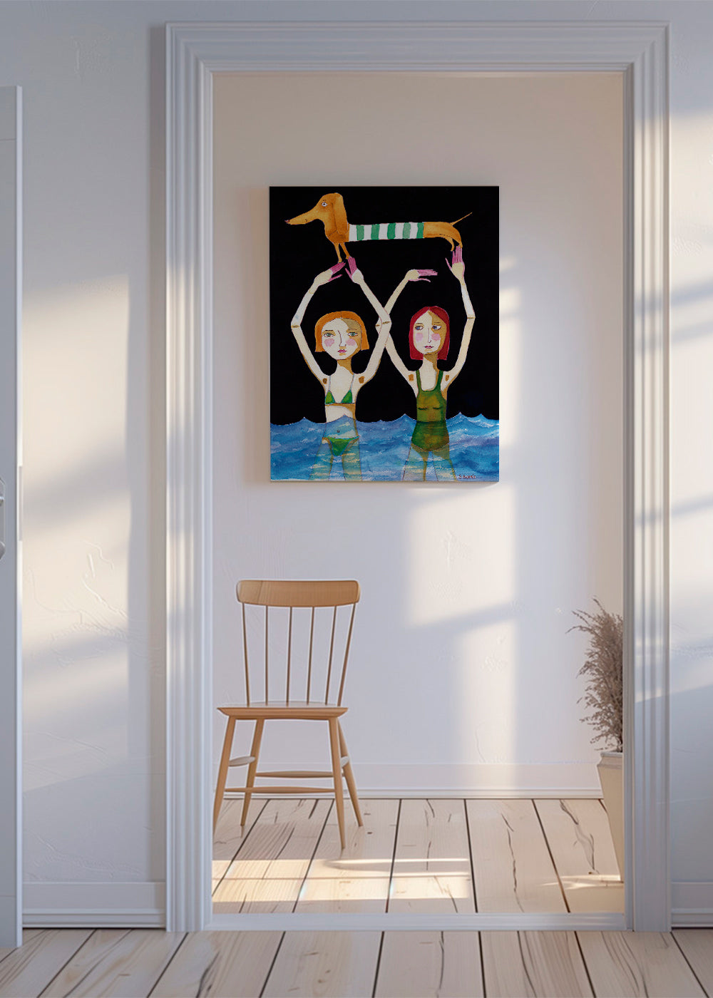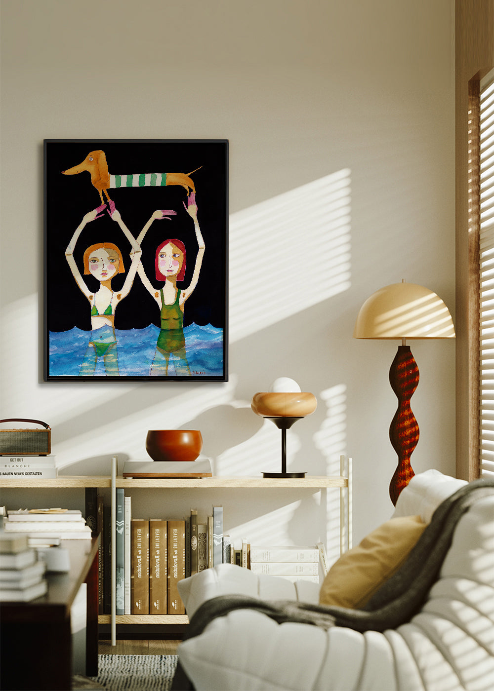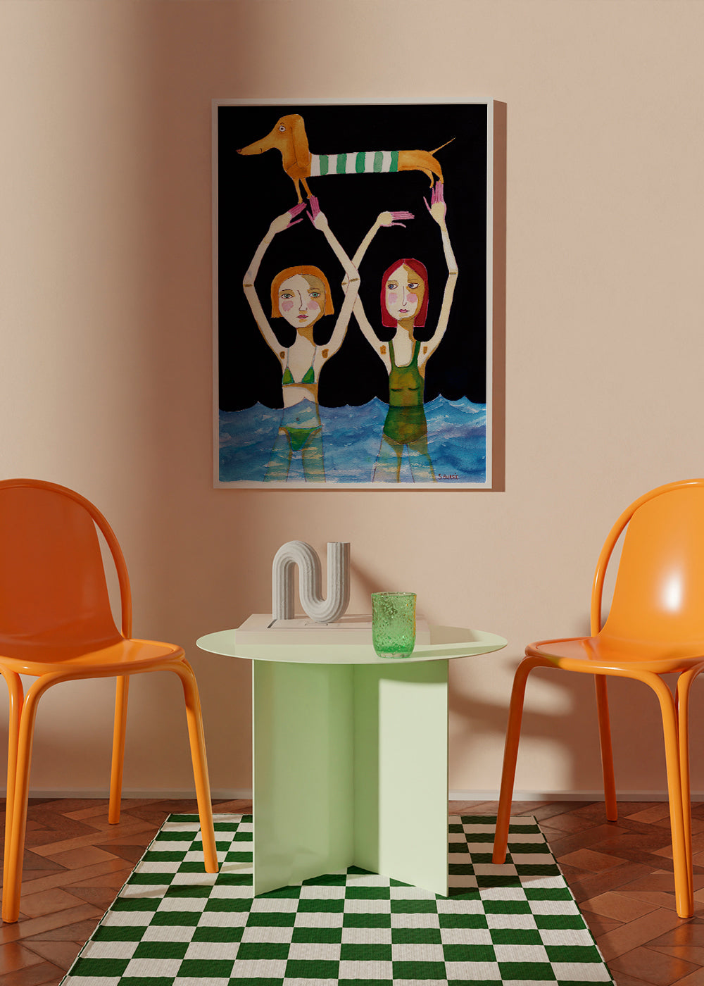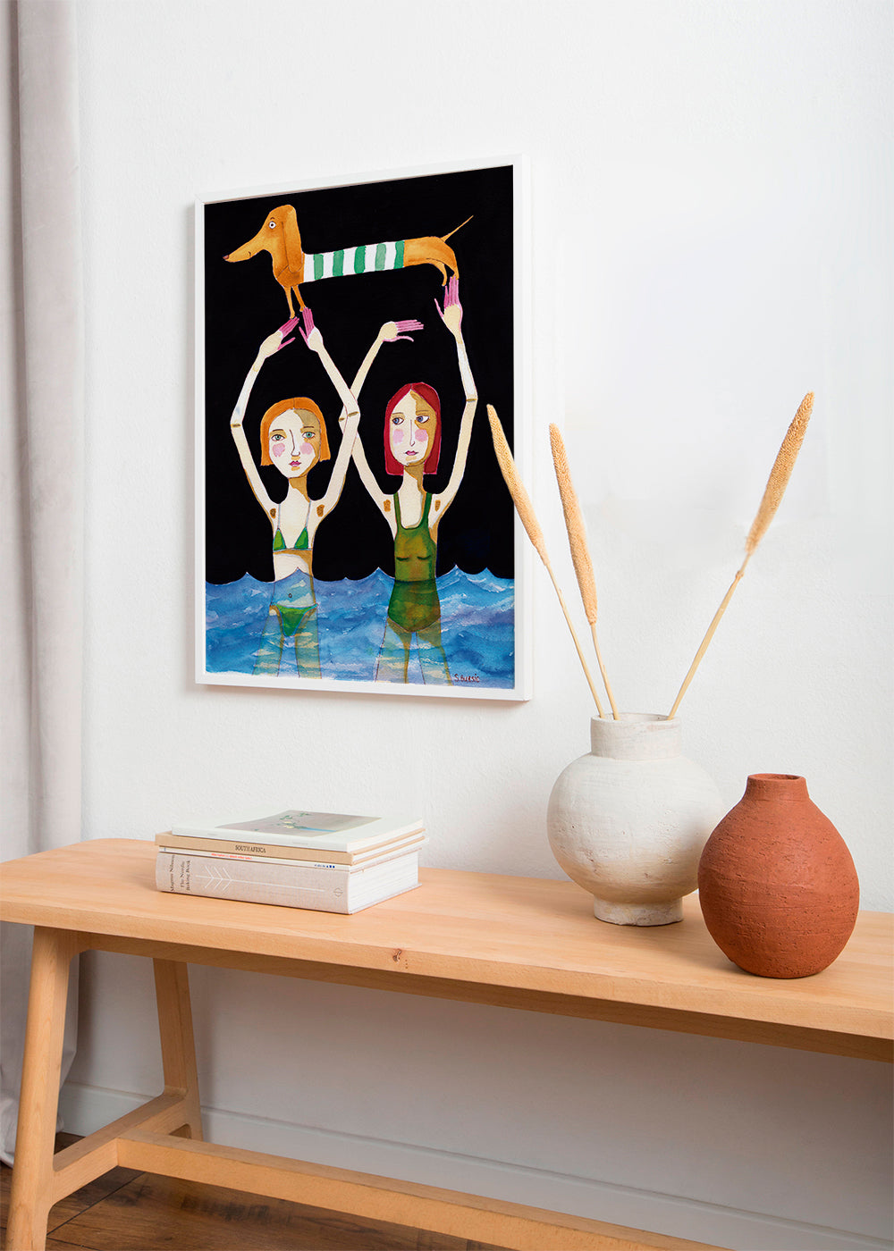Scandi-Poster Swimming Girls with Sausage Dog - Sharyn Bursic